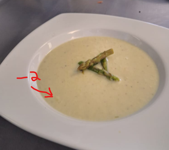 It might not be what you're going for with this dish but IMO a single shake of paprika (smoked or not) or cayenne pepper to give the white soup a little red blush before adding the asparagus would set it off well IMO.