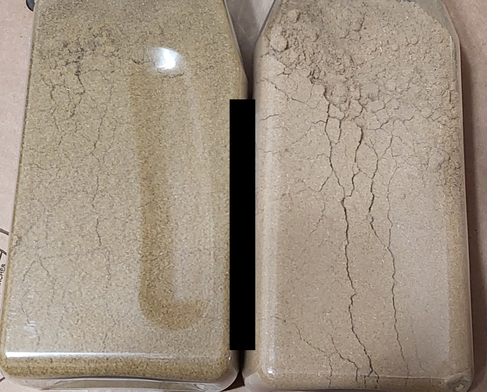 I got the one on the right and the seal wasn't intact and it's had this kind of off flavor and I finally had enough. I got the left one today. The right one looks like saw dust in comparison to the new one so maybe it had dried out.