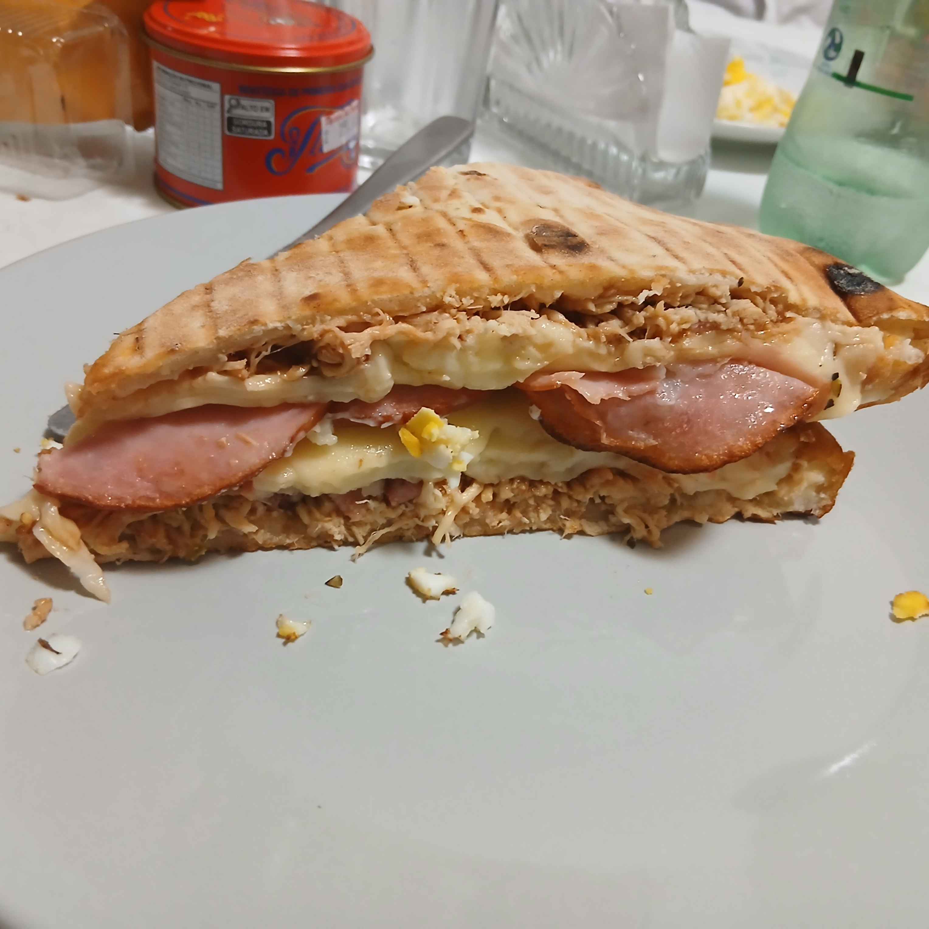 it has chicken, bbq sauce, two layers of melty mossarela cheese, ham, sirloin, egg and a thinner layer of chicken on top to finish it off. the texture is outstanding in a full bite