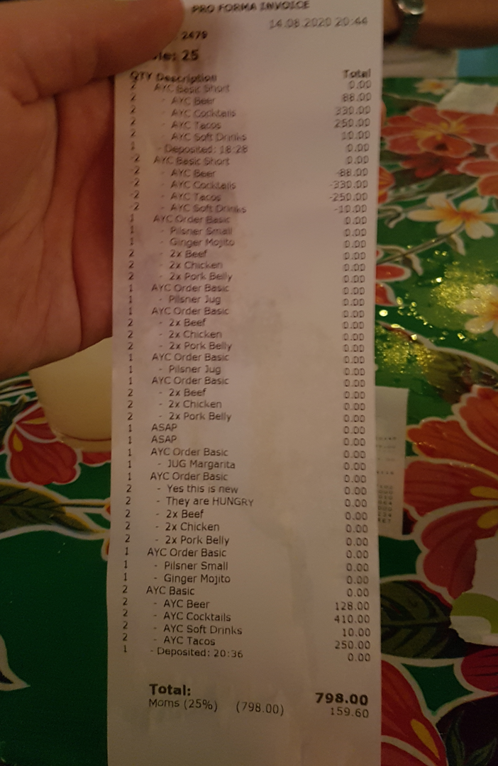 >>21961492>>21961595>>21961607>>21961616The "Moms" at the bottom of the receipt and no tip should have given it away. It was 798 DKK / 2, so around 60 USD per person (no tip given lmao).