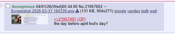>>21957497the day before april fool's day?