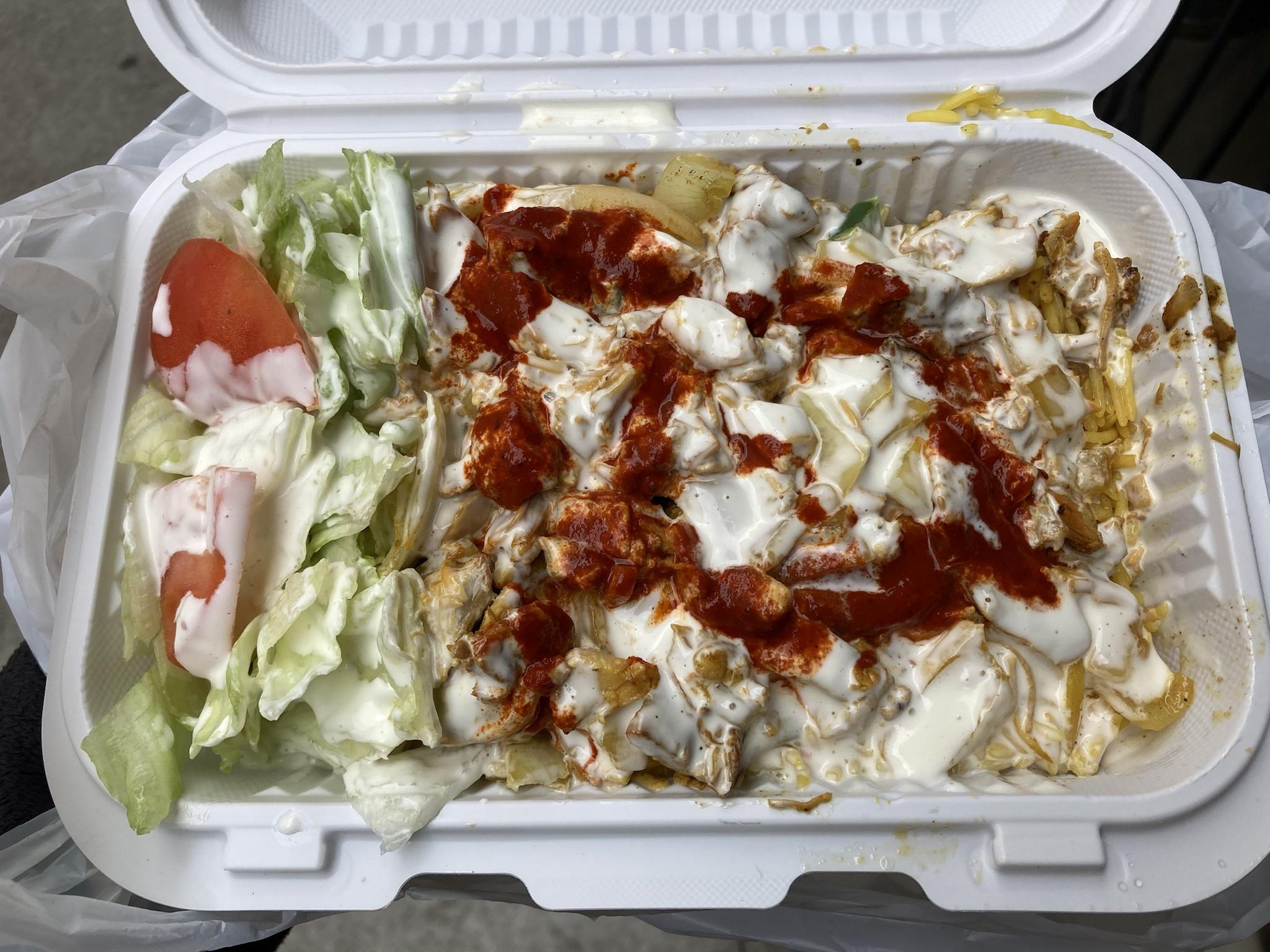 NY-style halal chicken over rice with appropriate sauces.