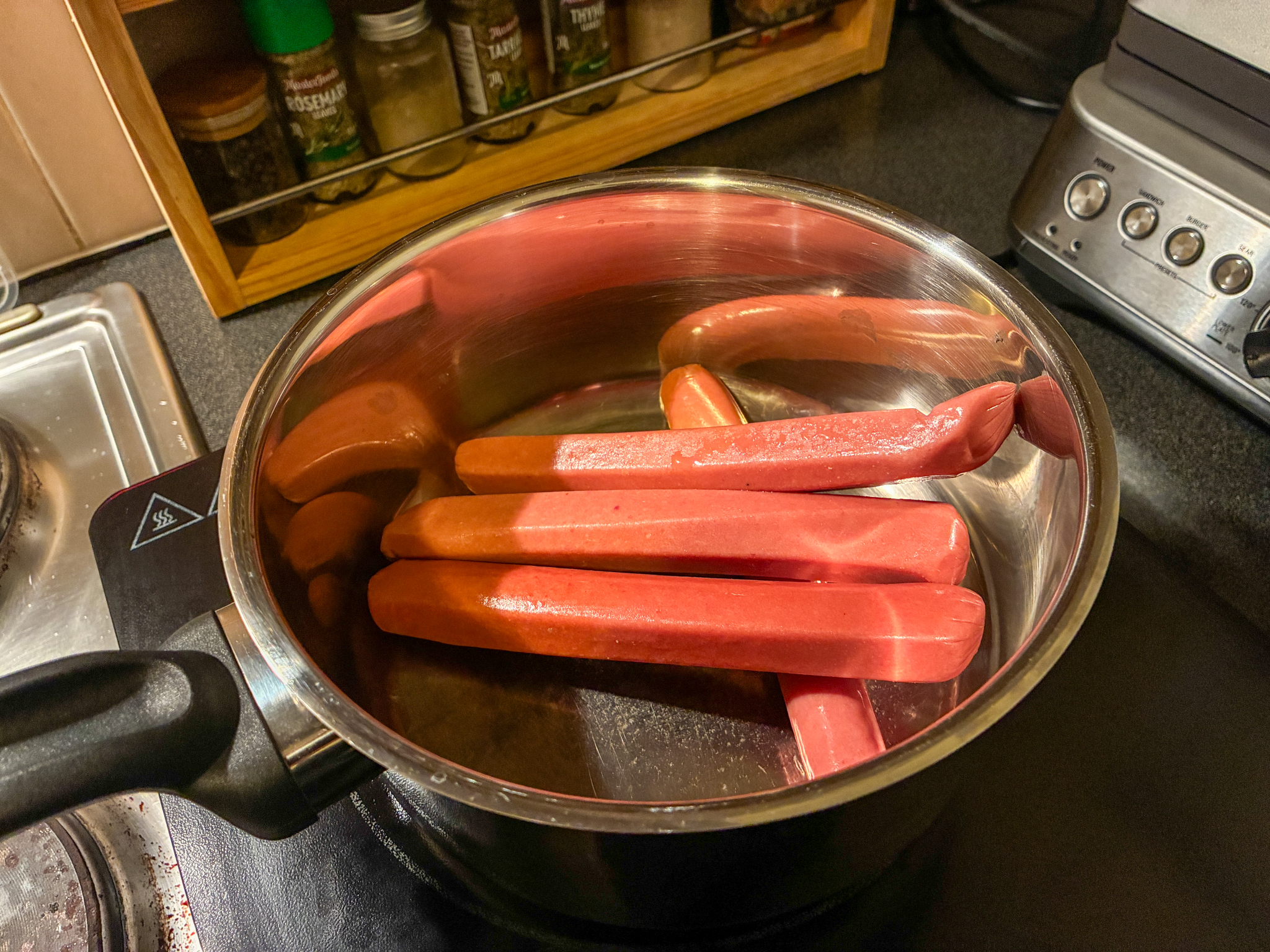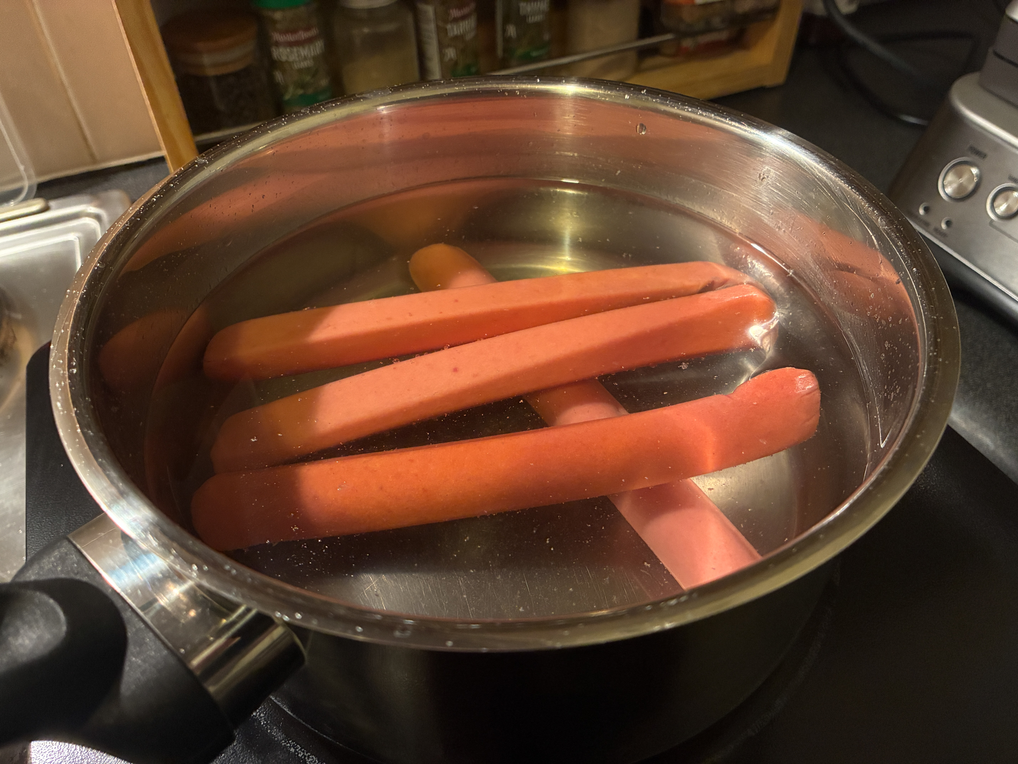 >>21963790And heeeere we go. Put the cold dogz in your saucepan. We're going to simmer these boiling-frog style, from cold. That way you know they are up to internal temperature once the water starts to simmer, no guesswork here.