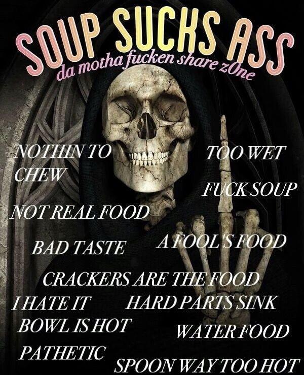 >>21961953>>21961962yeah soup it's just not satisfying for me. liquidy bullcrap.i might as well vape and drink tea instead.except for like thai curry which you put it over rice and it becomes a meal.mexican - they use weird ingredients and it's mushy. cilantro which I don't like. tortillas feels like biting into a baby's skin and having it stuck on the roof of my mouth. and then there's that orange rice which tastes like old shrimp. and when you mix chilies and lime together it tastes like vomit. give me a break popsicles makes a mess and it's not even real food. you'll never be taken seriously with the stained mouth of a five-year-old. bite it and your gums hurt so you're just supposed to suck on this frozen juice? but don't suck too hard or you'll be left with flavorless ice. nope.