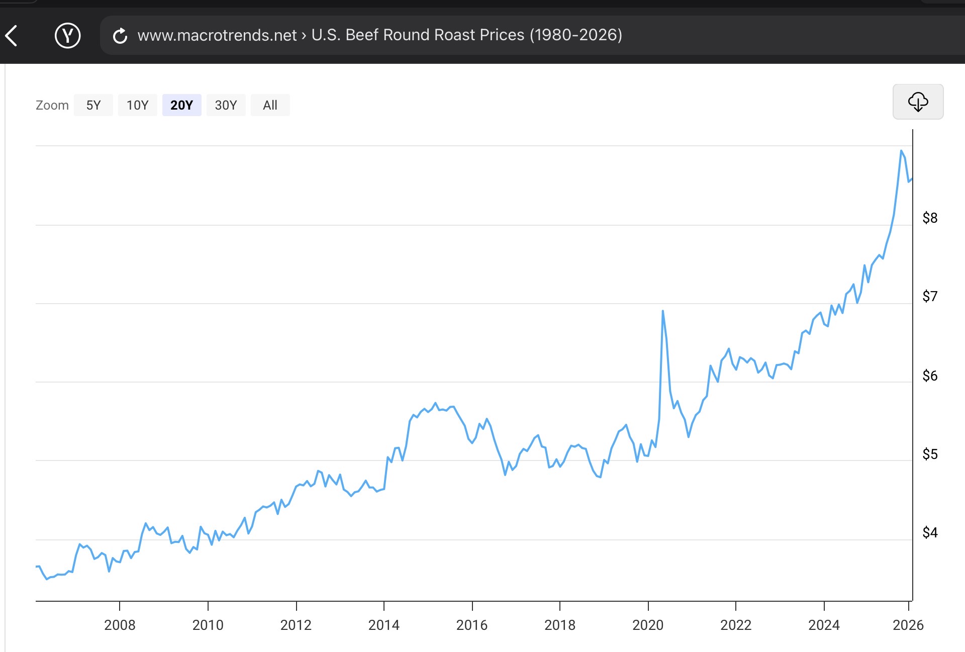 >>21963465>Yeah because C19 was still fucking with prices in 2023-2024, of course.Probably, I worked at a corner store during that period and in late 2023, I want to say around September, we couldn't get beer for about a month because supply chains were still fucked up. One of our distributors ended up bringing in a bunch of people at ridiculous wages to brute force the problem away. Of course that's just an anecdote, take it or leave it. That chart shows an increase of what I would say is just North of 50 cents per pound from 2023-2024. Let's be safe and call it 75 cents. 2025 appears to start at about $7 and 2026 has us at about $8.50, a $1.50 increase. 2020-2024 shows beef going from about $5 to about $6.75, a $1.75 increase over a 4 year term. Glorious Leader damn near matched that in one year and he'll probably outdo himself in the near future and you'll continue to make excuses for him for reasons that have no basis in reality.