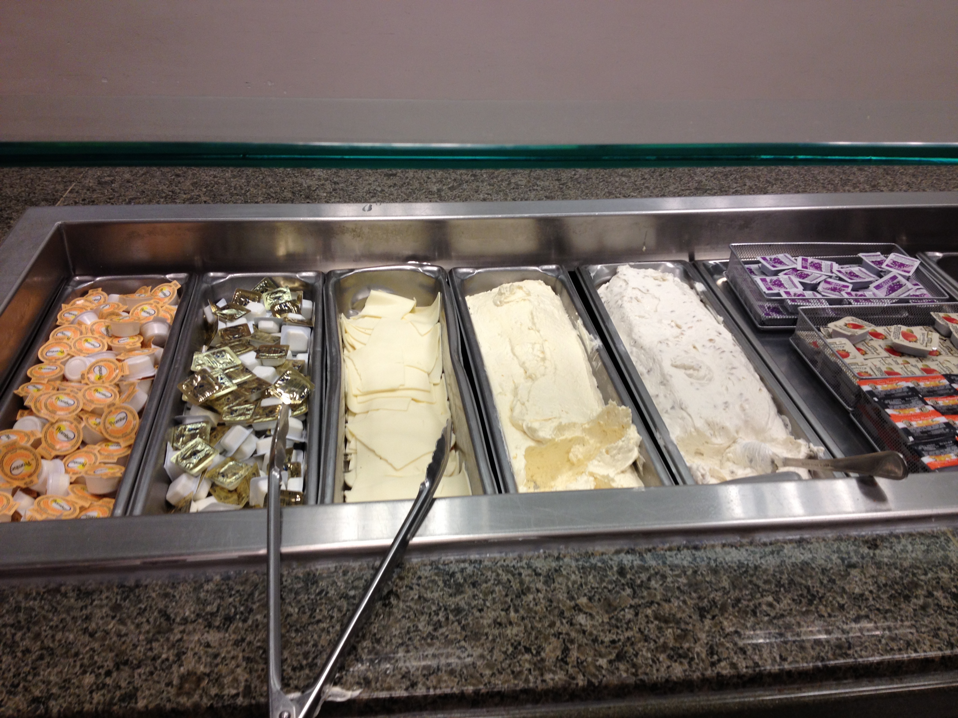 Let's see. We got butter, butter substitute, processed cheese, cream cheese, some other kind of cream cheese (veggie?) and some fruit preserves.