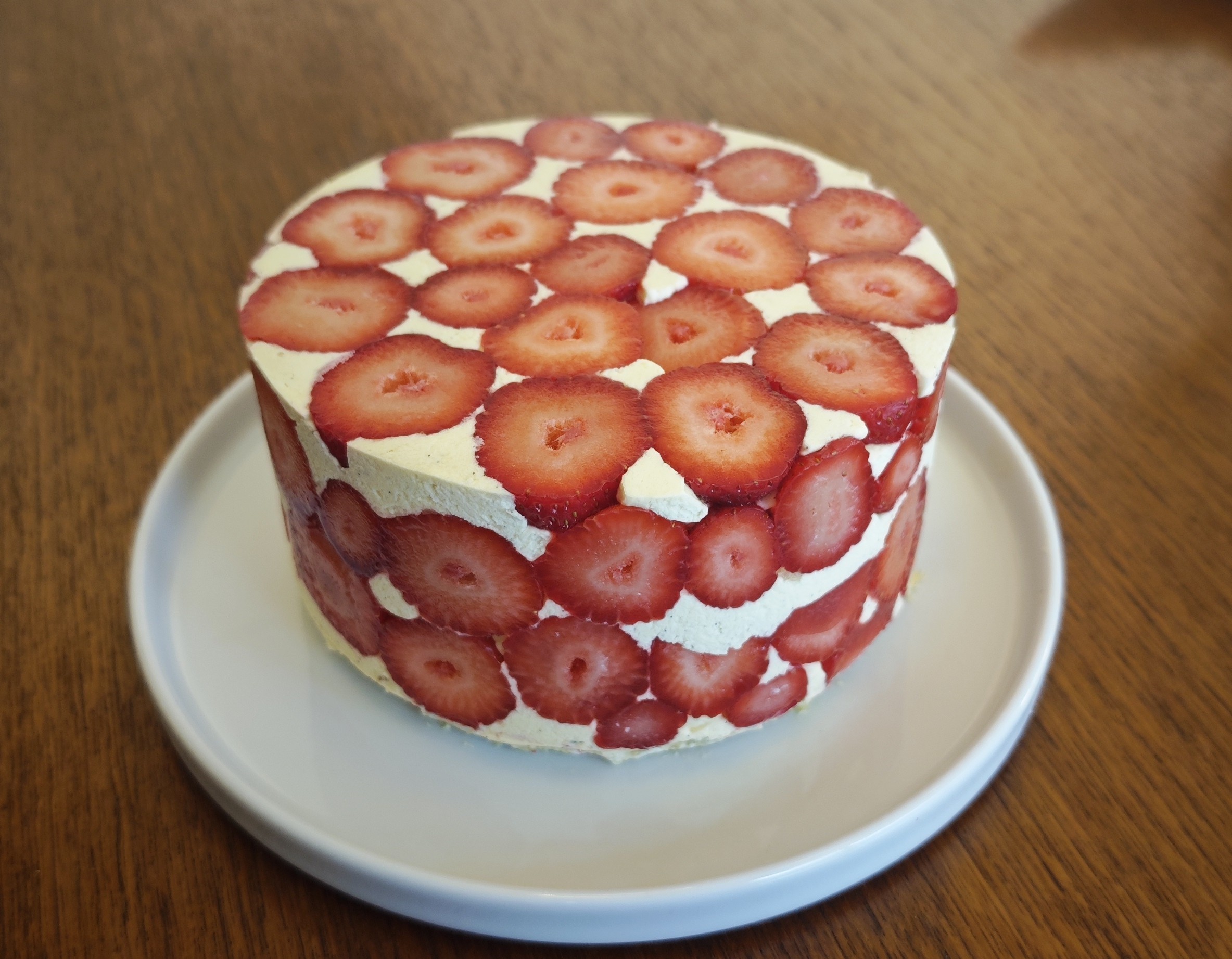The fraisier is composed of a crème mousseline, two layers of pain de gêne delicately soaked in syrup, and a strawberry coulis enriched with diced pieces of the fruit itself.Upon my next attempt, I shall see to it that the pain de gêne is rendered in finer, more graceful slices, thereby allowing a more ample proportion of crème mousseline.Here is the cross‑section, unveiled with due ceremony for the pleasure of your refined observation.It is quite exquisite, if I may be permitted the modest observation.