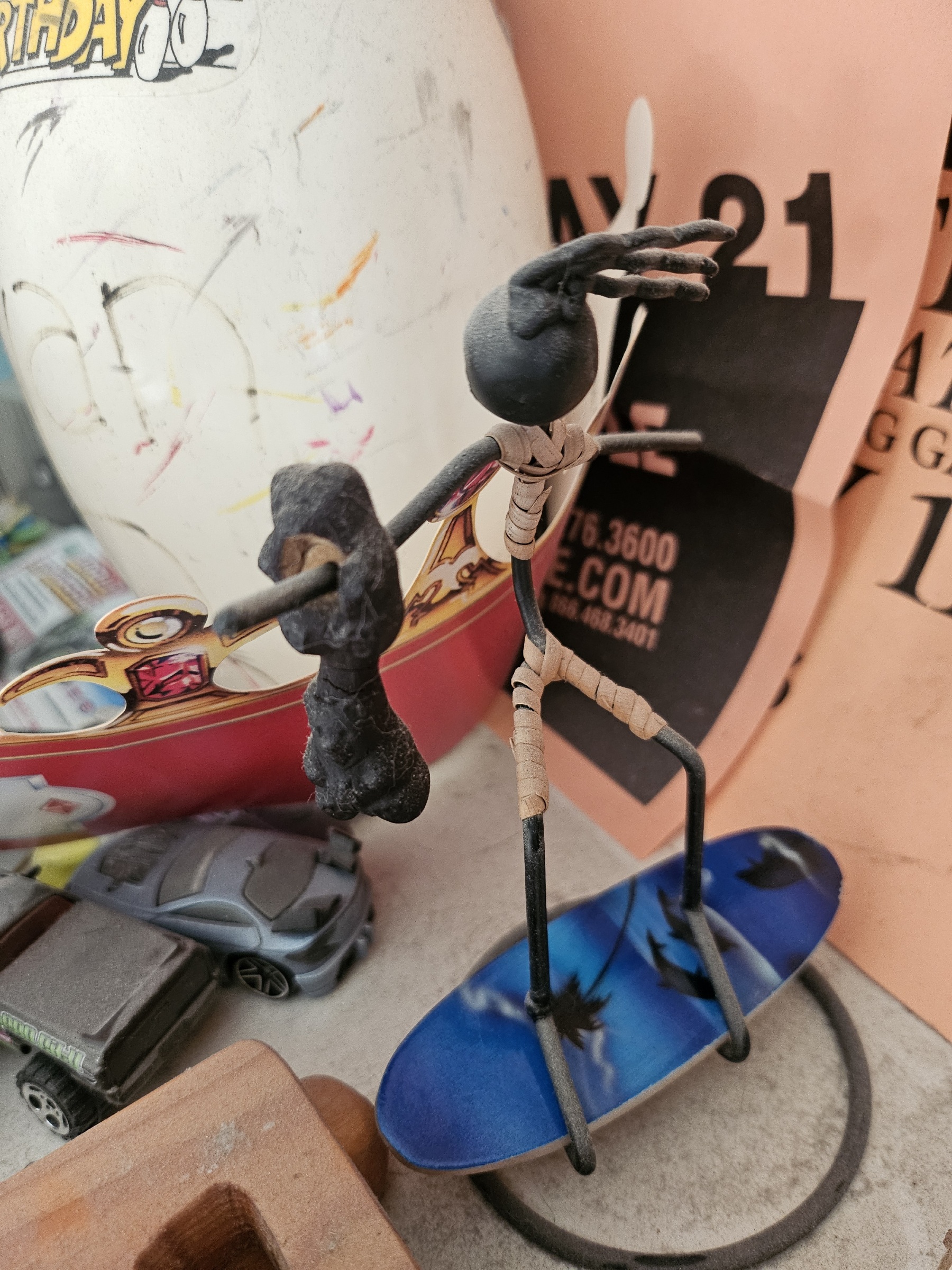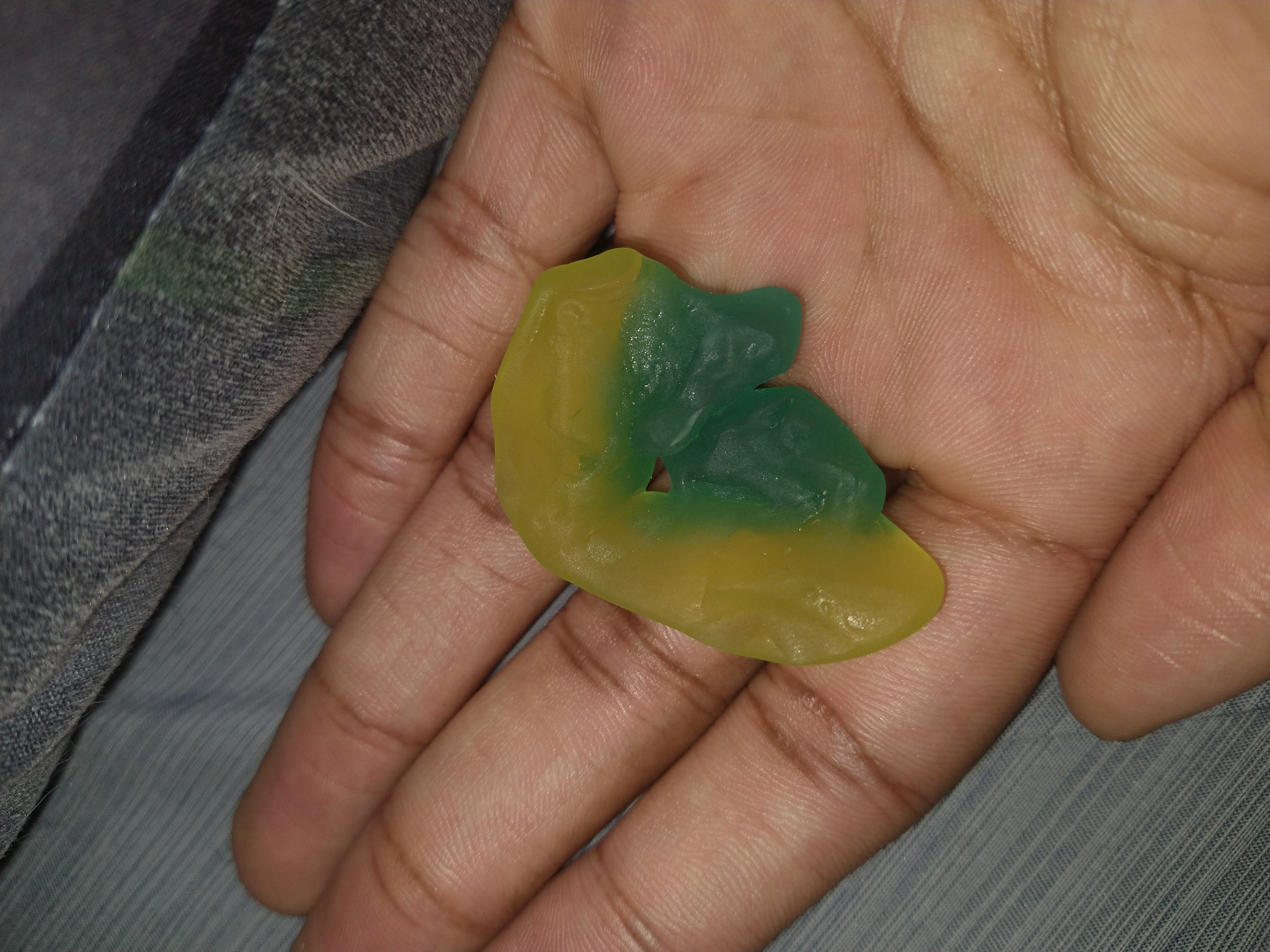 In high-school i found two gummibears that were fused together. I put them on this surfer dude and here they are over ten years later. They were orange once.