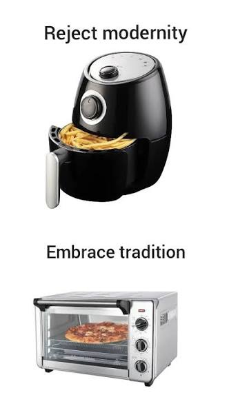 >>21971787Air fryers and countertop mini-ovens are luxuries. They aren't necessities when most places have an oven preinstalled. And the cost of buying a new appliance is literally worth years of using the oven which itself will probably outlive the mini appliance until you need to buy a new one.They aren't a meme; they truly are convenient when you use them for what they're good at. If you like making frozen foods crispy, air fryers are good at that (don't overload it). If you get the ones that look like a normal countertop convective oven (the fans are placed differently so I wouldn't exactly call them a conventional "air fryer"), the capacity might be bigger and they heat your food pretty close enough to a normal air fryer that you wouldn't complain. Your normal oven can do everything they can do, but using it for smaller items might be considered less convenient for some. You do you. I love the cheap countertop oven from my parents years ago that I use to reheat foods. Would I ever get a newer, bigger one? Maybe one day, idk. I don't feel I need it right now. But I'm sure I would love it if I did get it.