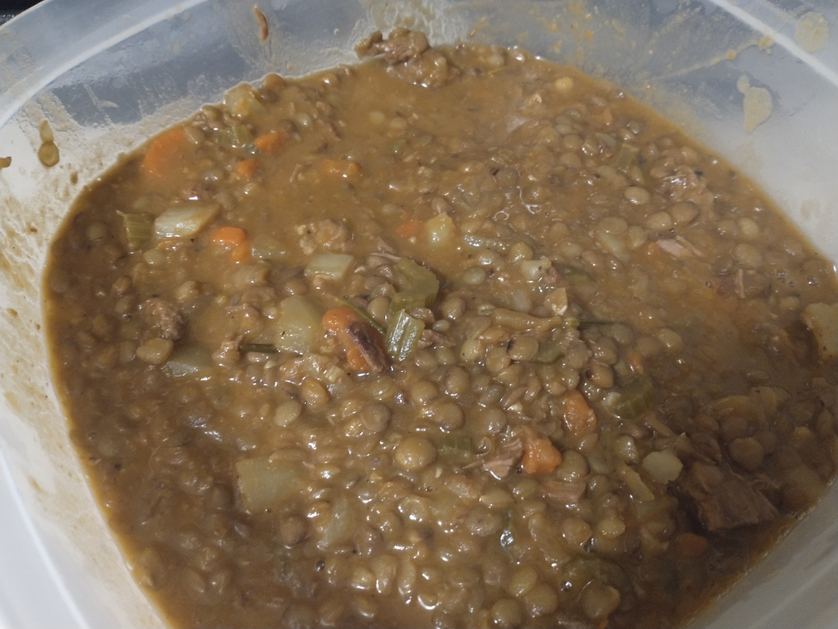 after simmering the meat and vegetables in beef broth for about 90 minutes the meat seemed pretty tender so I added a bunch of lentils that I had pre-cooked the night before but then I remembered I forgot to add the potatoes I had diced up earlier so I dumped those in as well and thought "oh well, the lentils are going to get totally ruined while I cook the potatoes". then I left the kitchen for about 15 minutes and as I was coming back to check on the stew, I noticed an odd smell. as I got closer I realized it was the smell of burning food. sure enough, as I entered the kitchen I saw black smoke billowing forth from the pot. I quickly turned on the range hood and took the pot outside until it stopped smoking. (I was extremely lucky that the smoke never tripped the fire alarm because they're all connected - I would have woken up my entire building. you also can't turn the alarm off yourself.) Anyway, after I took the pot back inside I poured it into a big container and apart from a couple of bits of charred food that I fished out it looks completely fine to me so I am going to probably eat it. I don't think there's any way the potatoes are done but there's nothing I can do about that now except I guess fish them out and cook them more on their own.anyway, it seems weird to me that it would have started burning considering there was still plenty of liquid inside (and, yes, I added extra broth since I know lentils soak up a ton of liquid. but again they had already been cooked for probably 30 minutes and had only been in this pot for about 15). I guess I underestimated them.