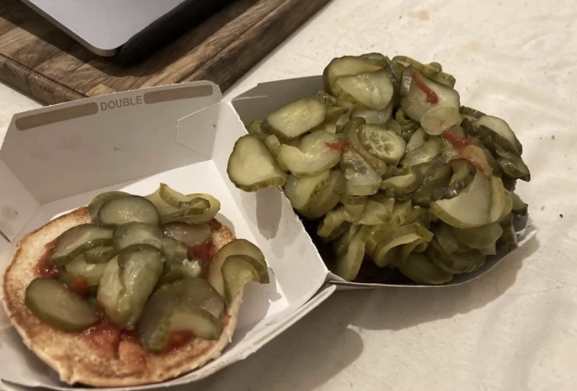 >>21975101I ASKED FOR NO PICKLES AND THEY GAVE ME THE FUCKIN MC PICKLE POUNDER, BRO WHAT THE FUCK IS THIS
