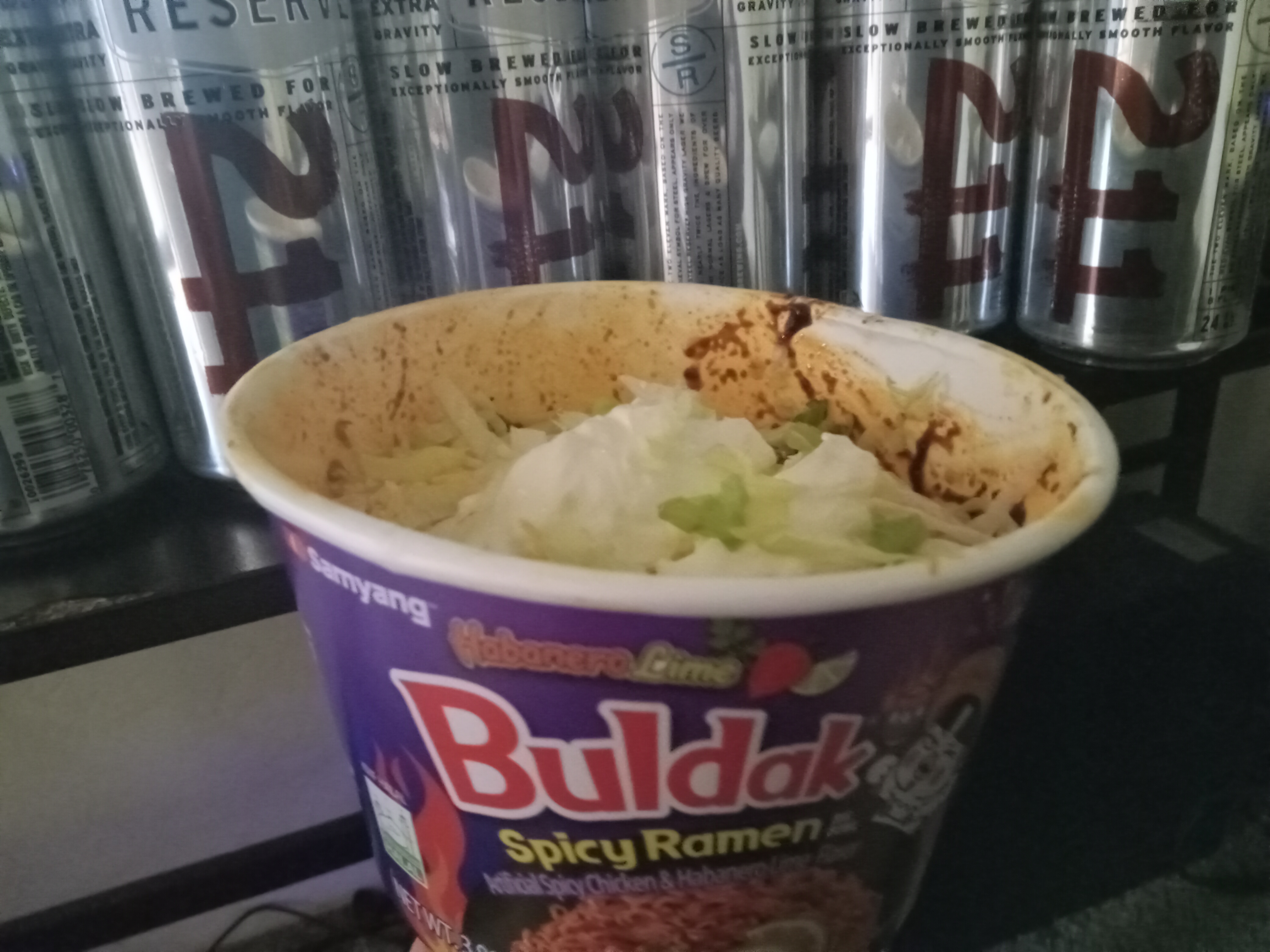 Buldak Habenaro Lime Spicy Ramen bowl topped with day old ground beef, half a lime's worth of juice, a couple splashes of Valentina's, some taco cheese, sour cream, and shredded lettuce for garnish.