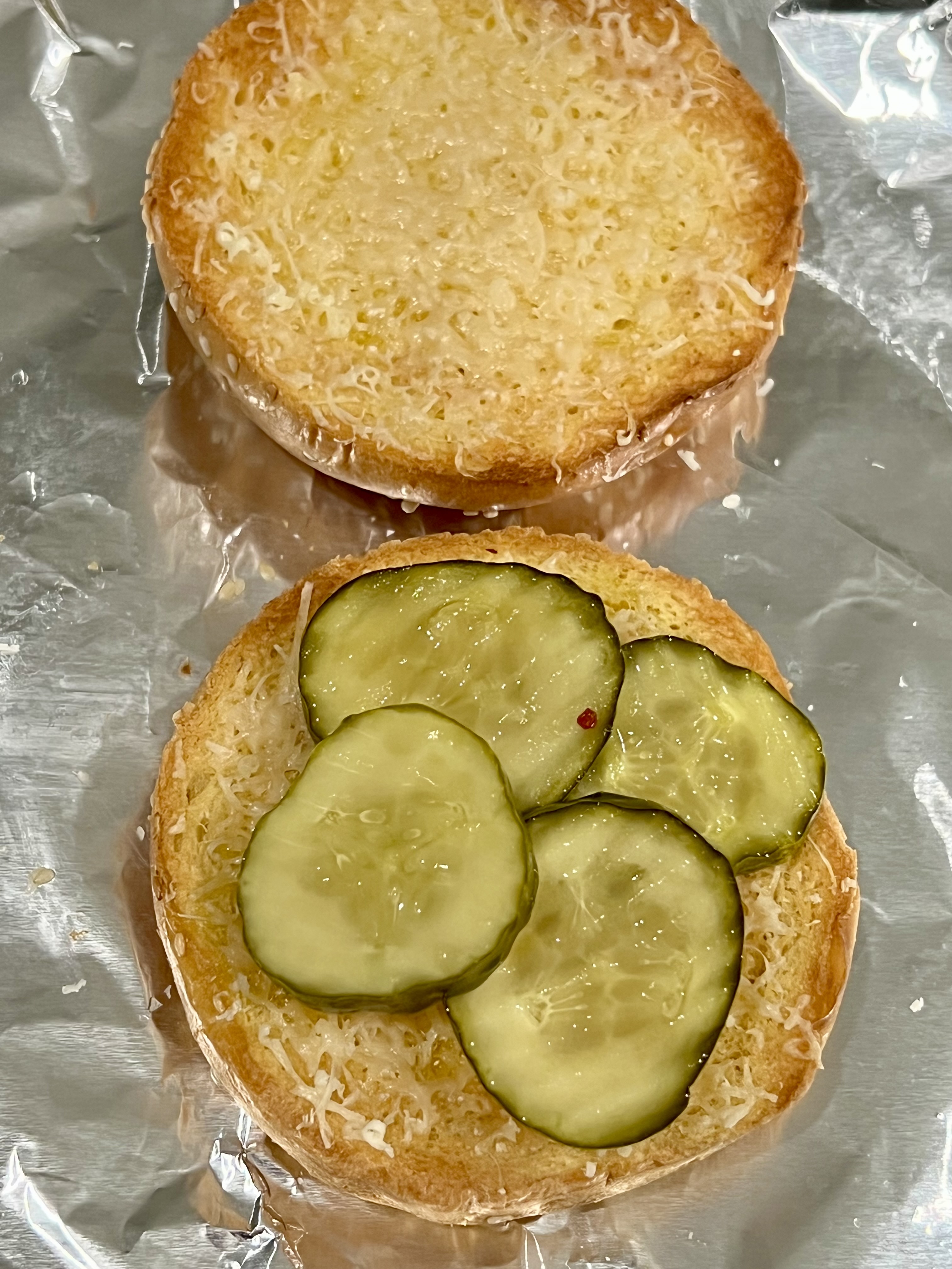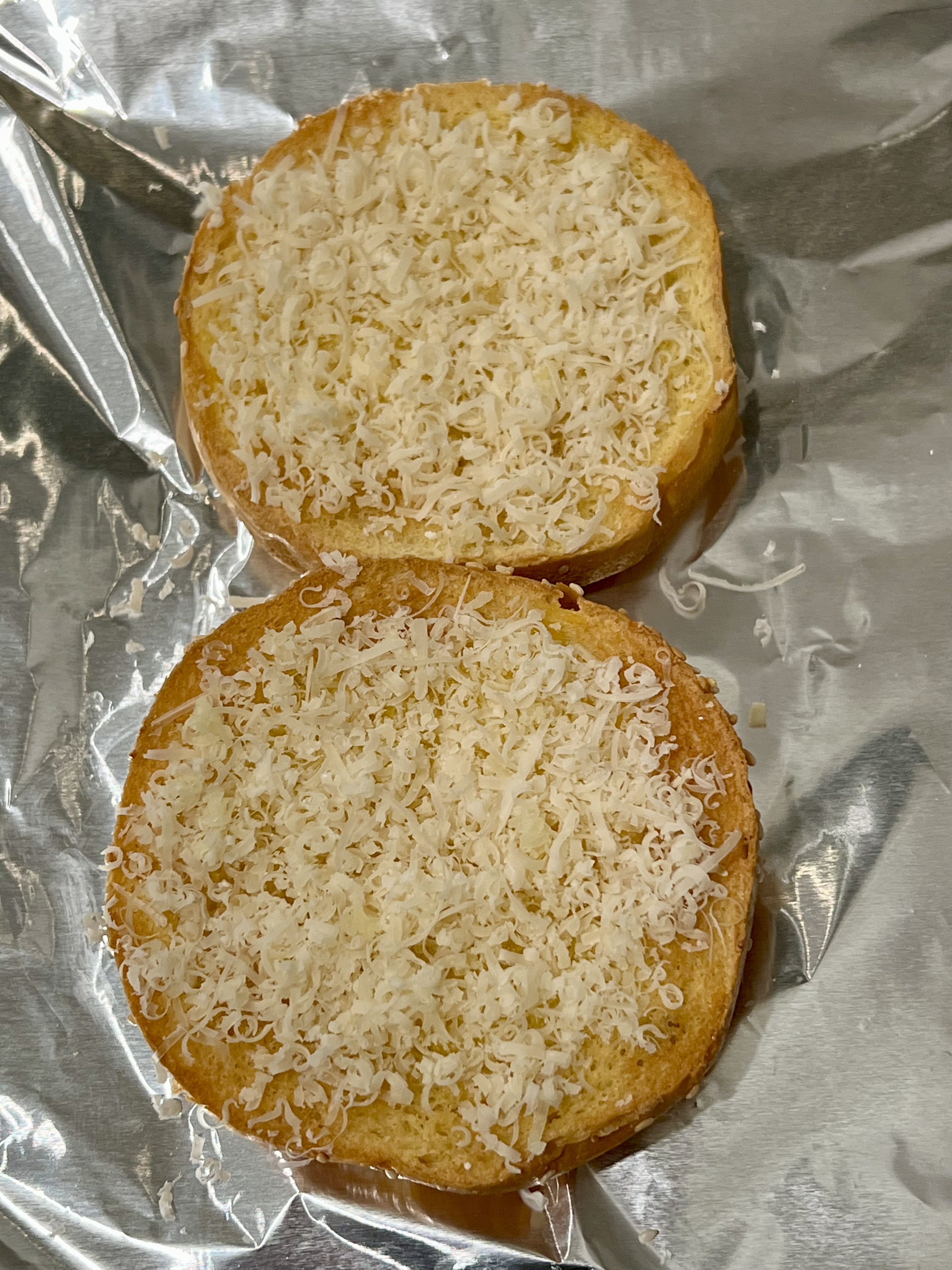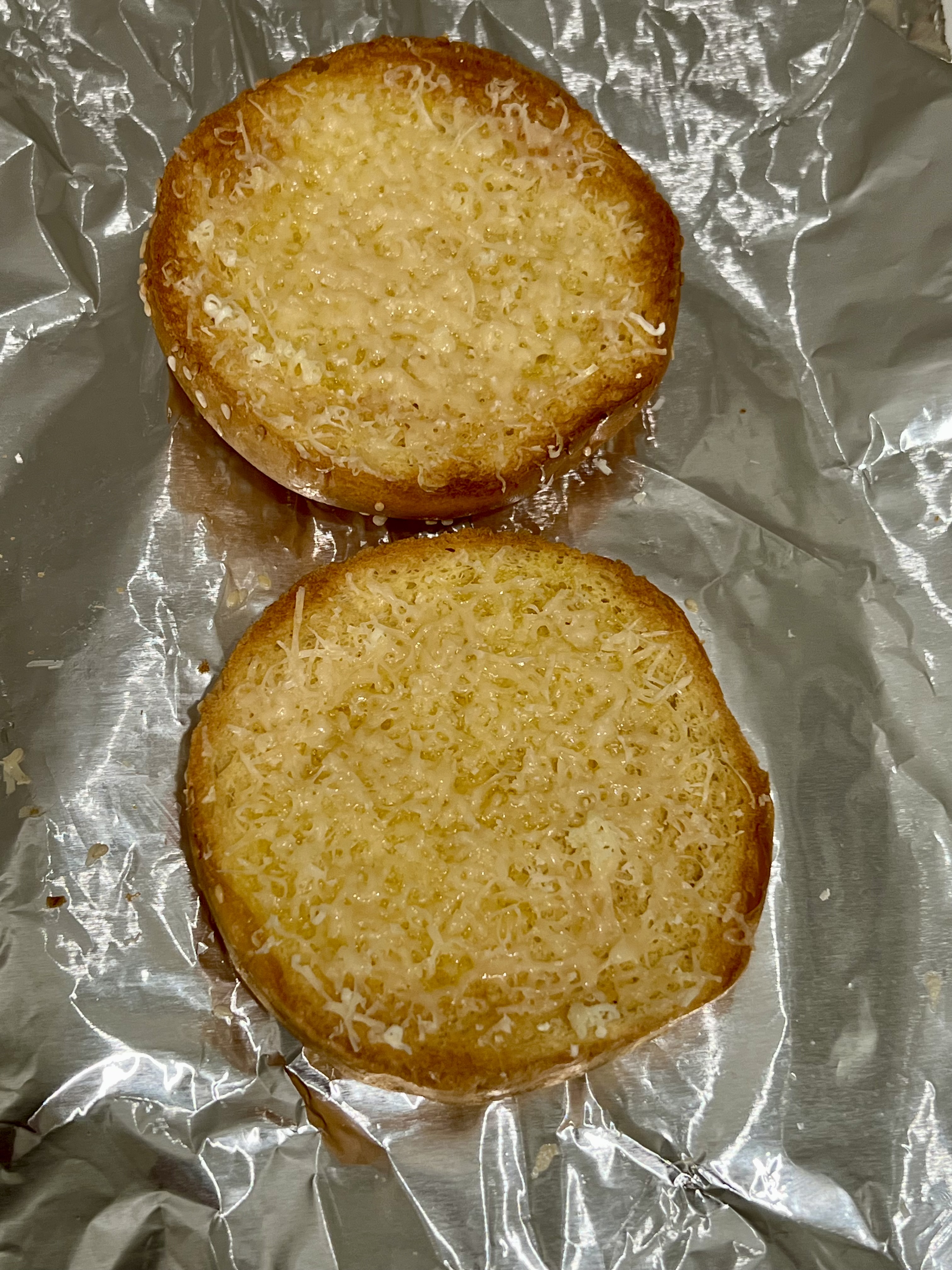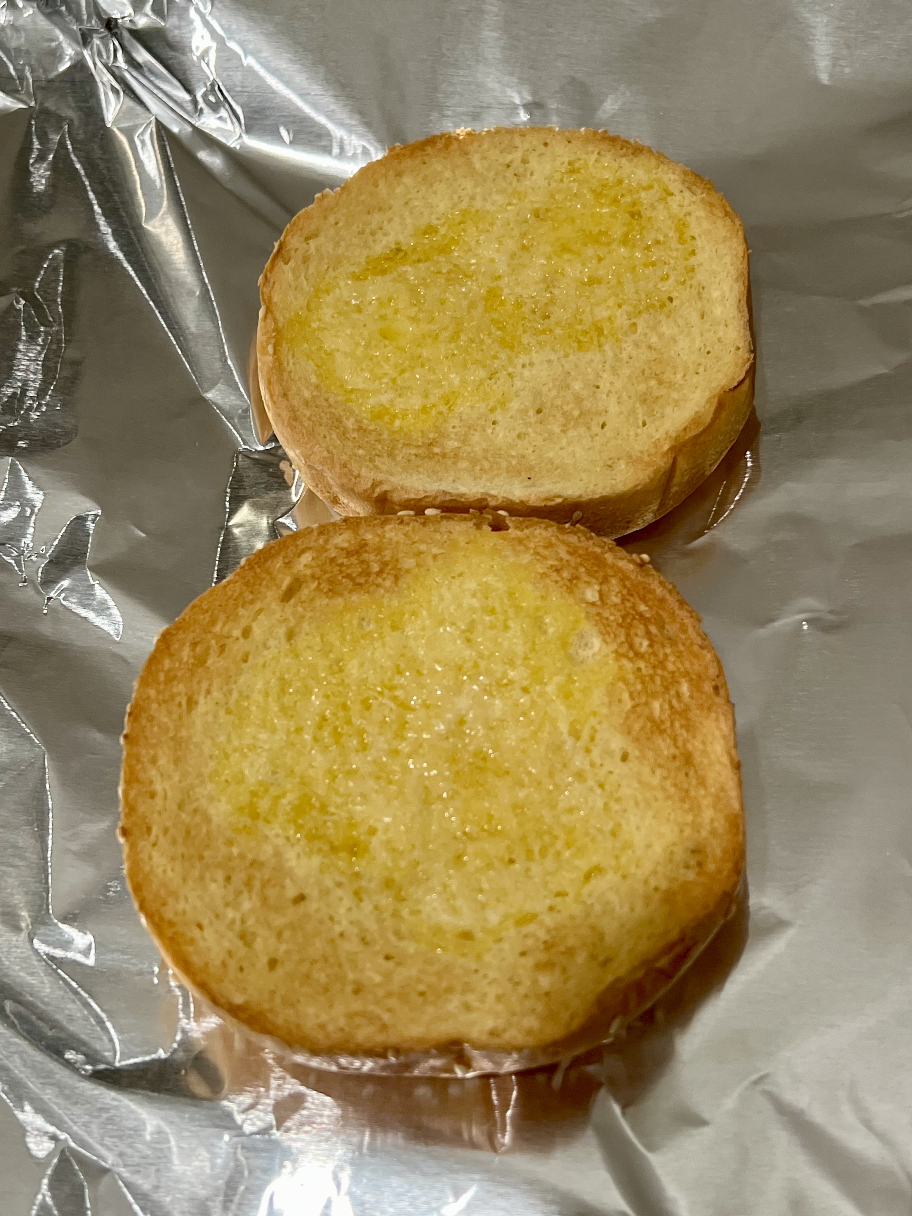 Buns toasted in the broiler.I’m going to add a thin layer of cheese so the sauce doesn’t soak directly into the buns.