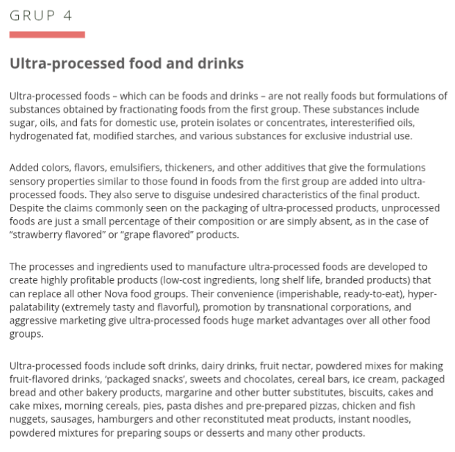 It's not a poorly defined group anon. Ultra processed foods are defined by being creations that the average home cook couldn't come close to in their kitchen. Do you think you could re-create Flamin' Hot Cheetos at home and have it taste exactly like the prepackaged ones? No, you can't because the Cheetos contain ingredients that no home cook would have in their kitchen. I cant remember the last time I was over someone's house and they said "oh the stew looks good, better add some Red 40!".