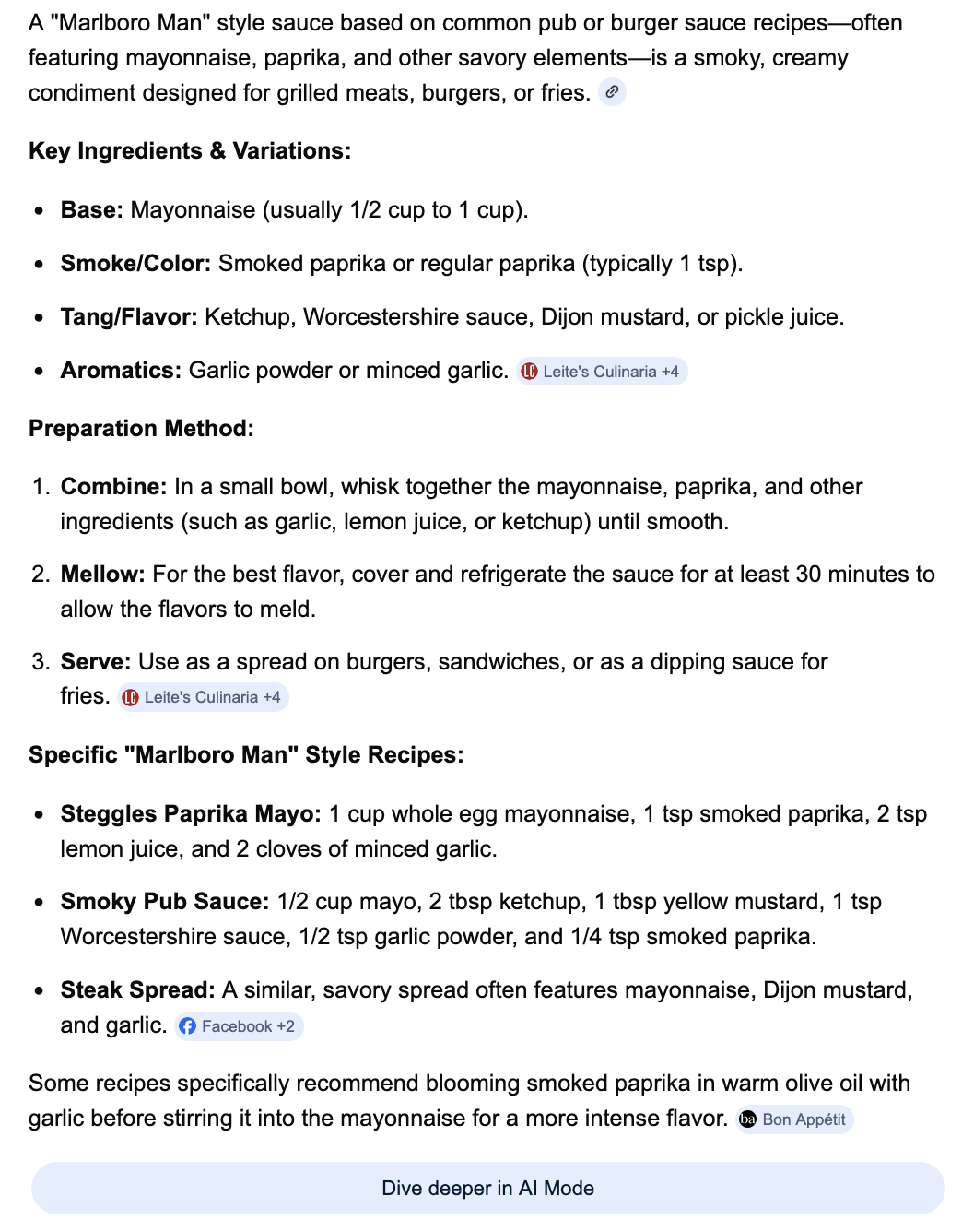I use Walmart paprika but I'm sure good paprika would be better. I got it from bon appetit like 10 years ago. They called it Marlboro Man sauce and I've never been able to find the original recipe again and it basically only exists in my mind now. The one I make isn't even the original but the general guidelines are enough. Just bloom paprika and whatever else you want in some olive oil and mix into mayonnaise. The most important part is blooming the paprika until its dark (in my opinion) because you get this smokey and slightly bitter flavor that is very unique.