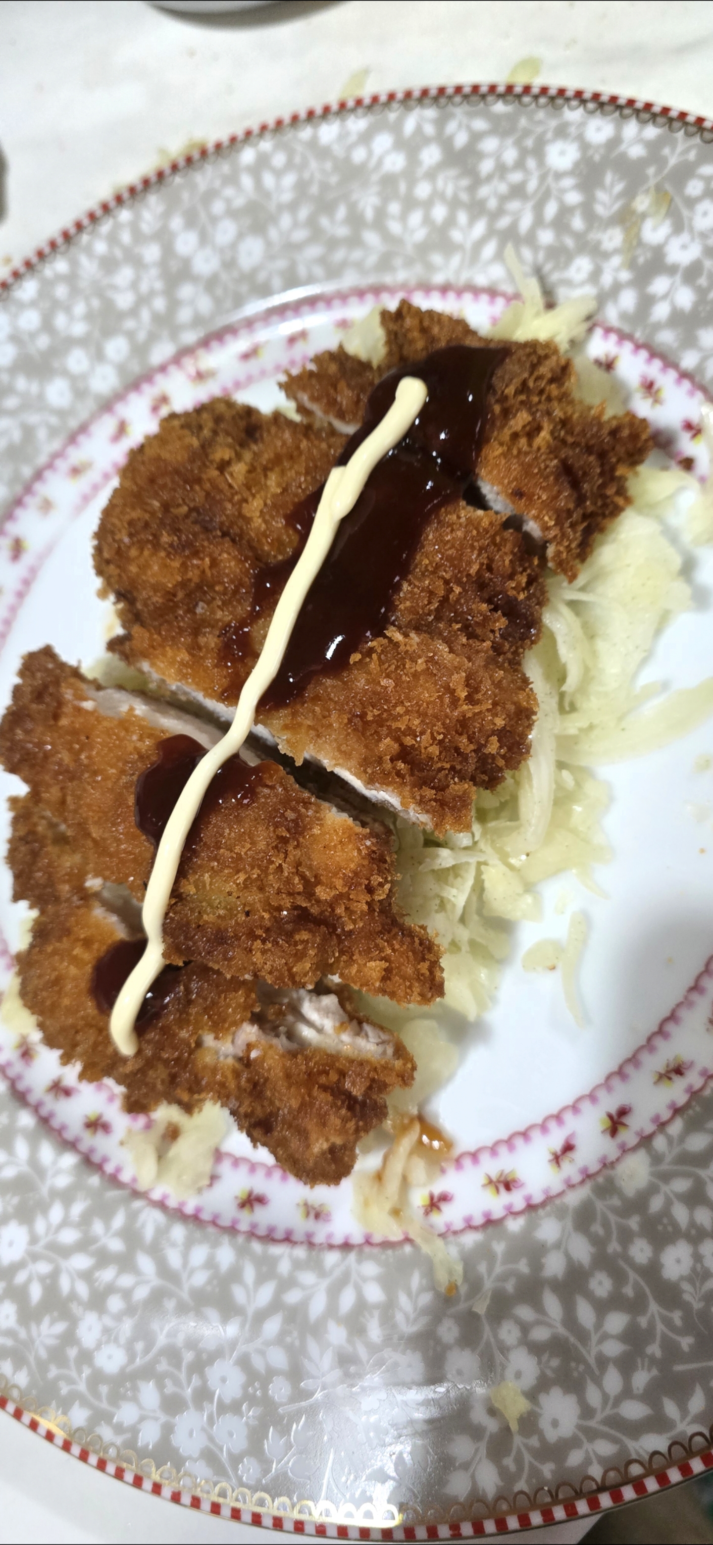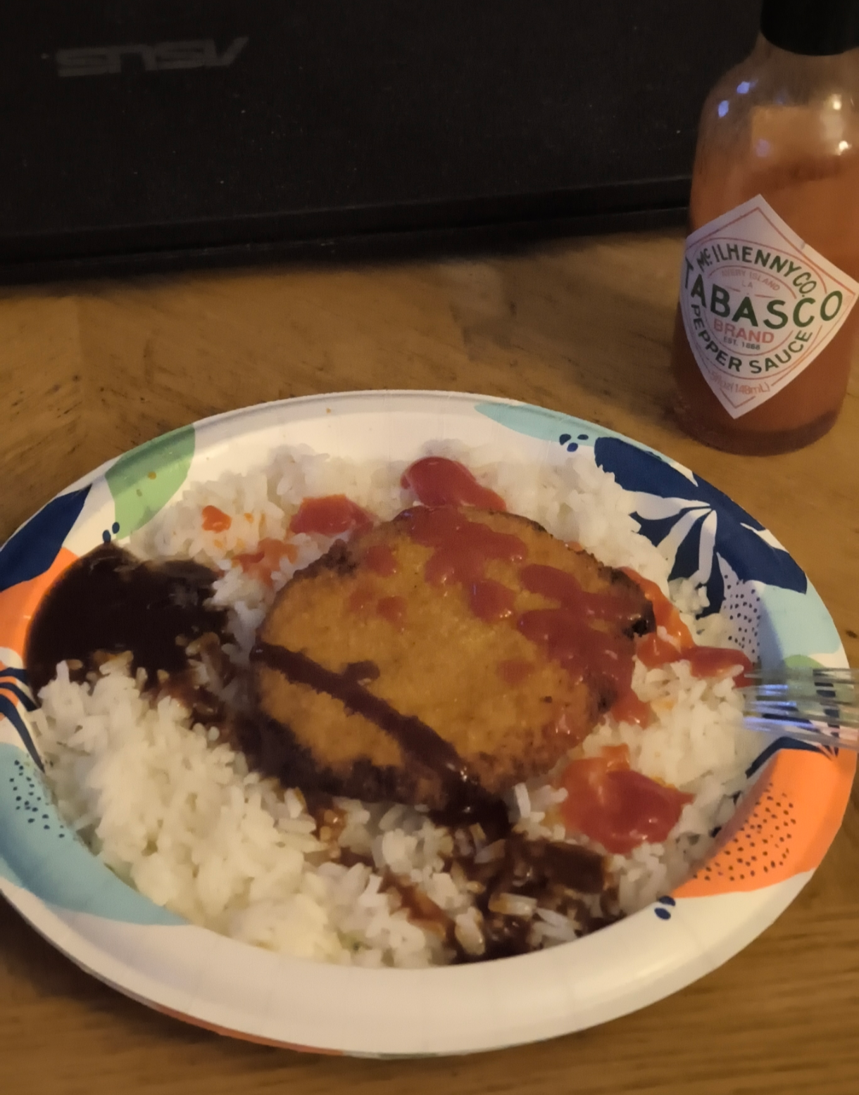 >air fried breaded chicken patty>over rice>two types of sauce>side Tabasco Bon appetit!