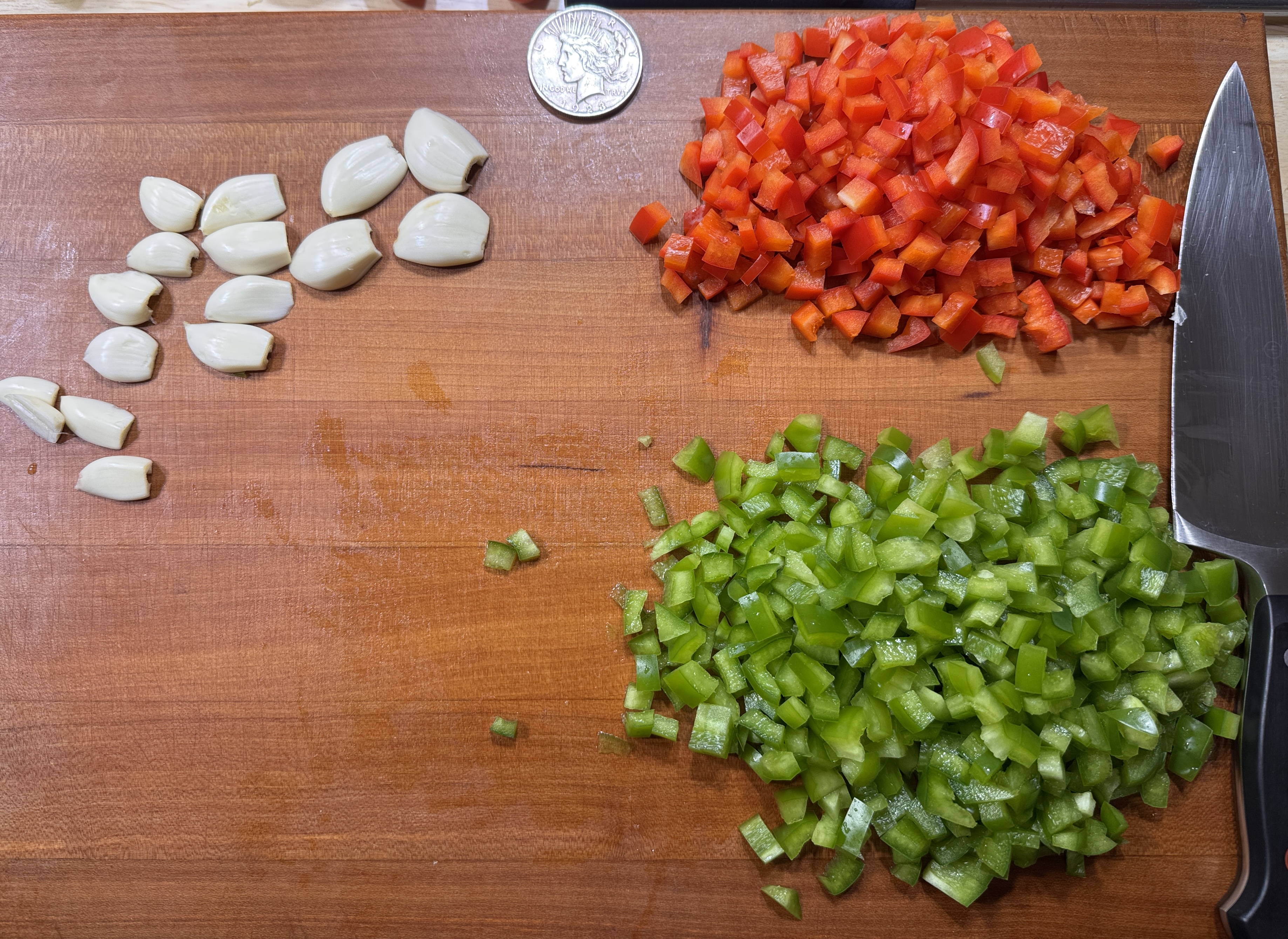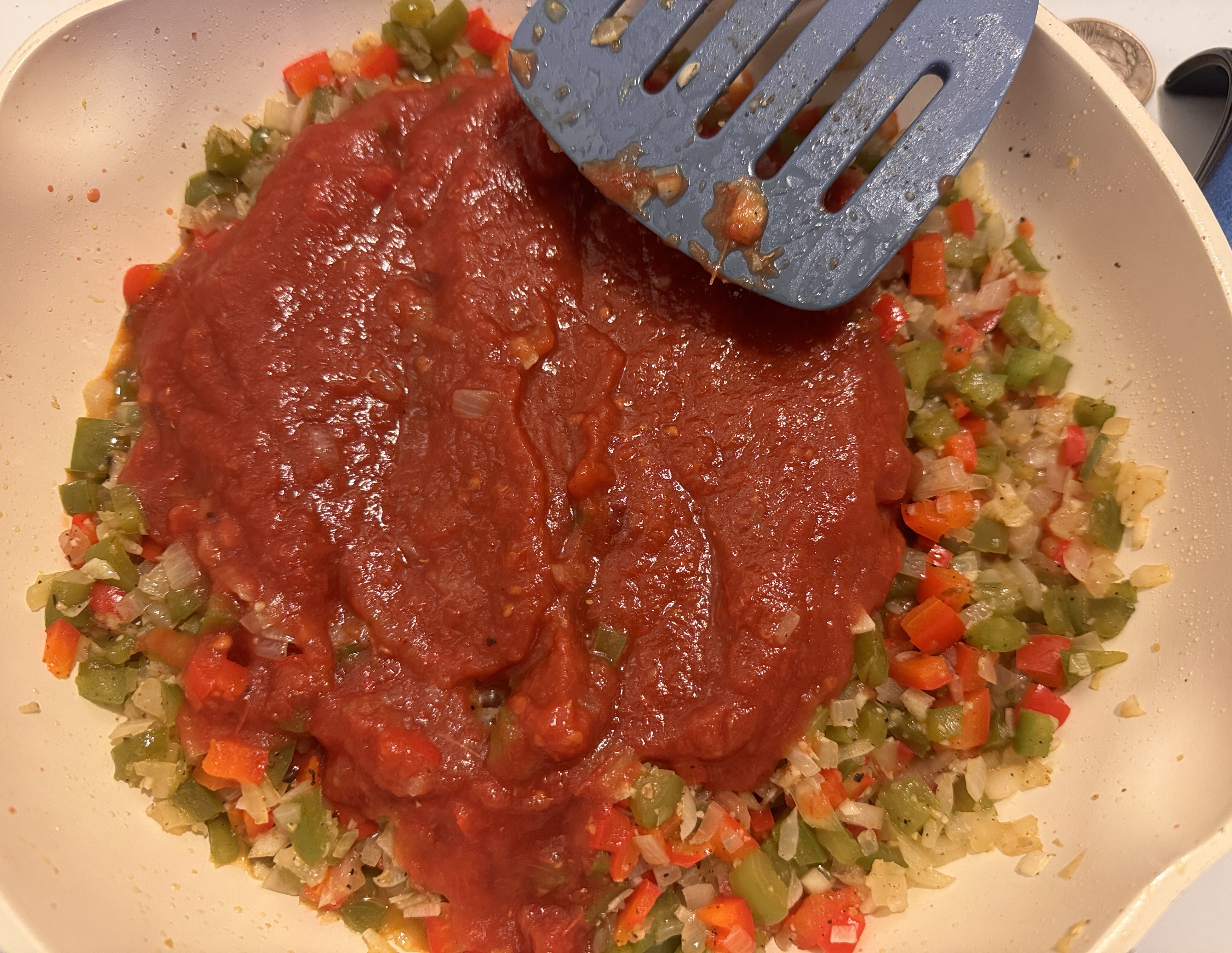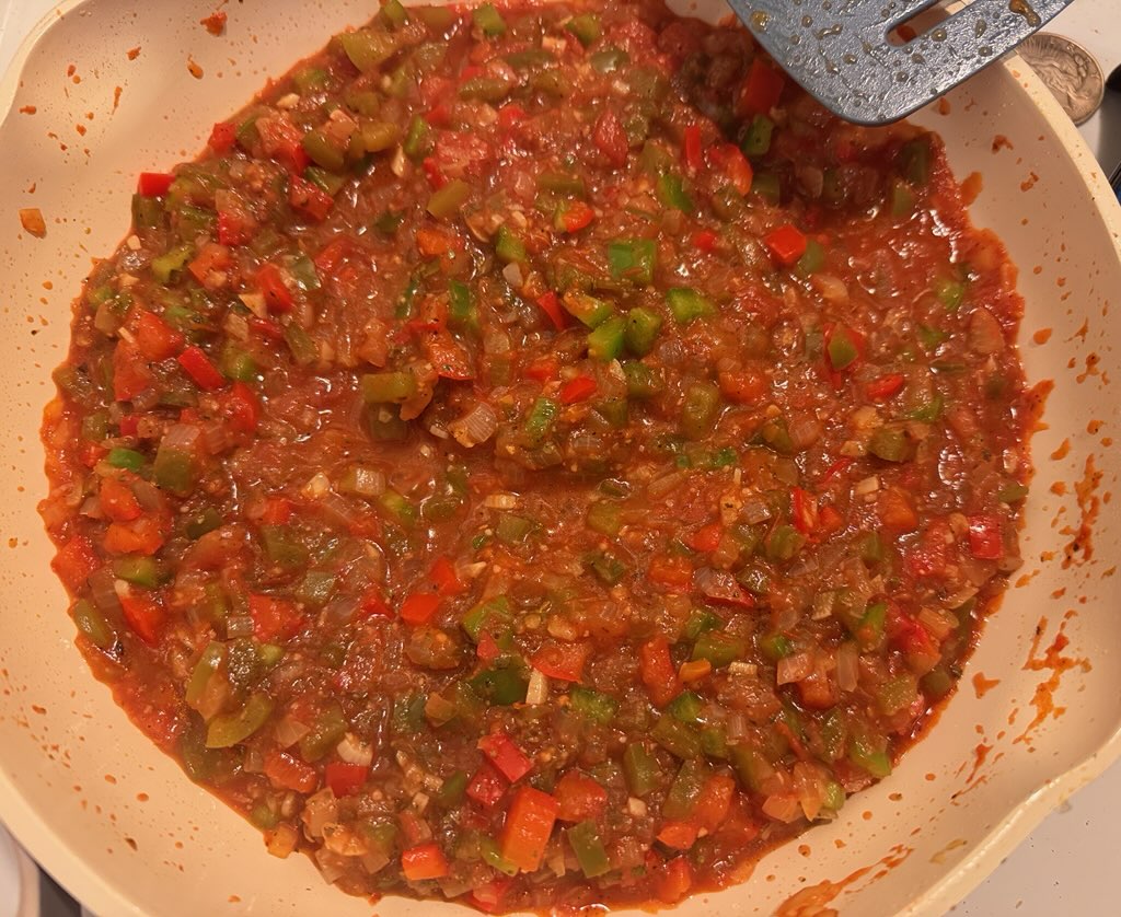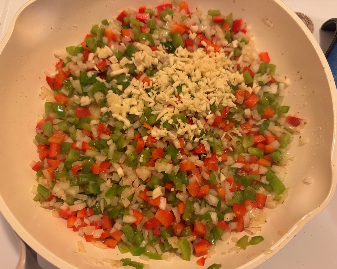 >>21983868EVOO in, peppers and onions in (prior)>cook a few minutes, garlic in