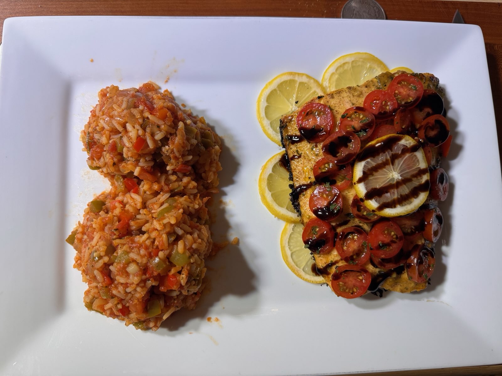 >>21983900two scoops and plated, probably should've sauteéd the sliced tomatoes first; finished with a balsamic vinegar reduction glaze. Next time I should probably plan what I was making beforehand as well but I wanted to use the fresh veg sooo>bosh