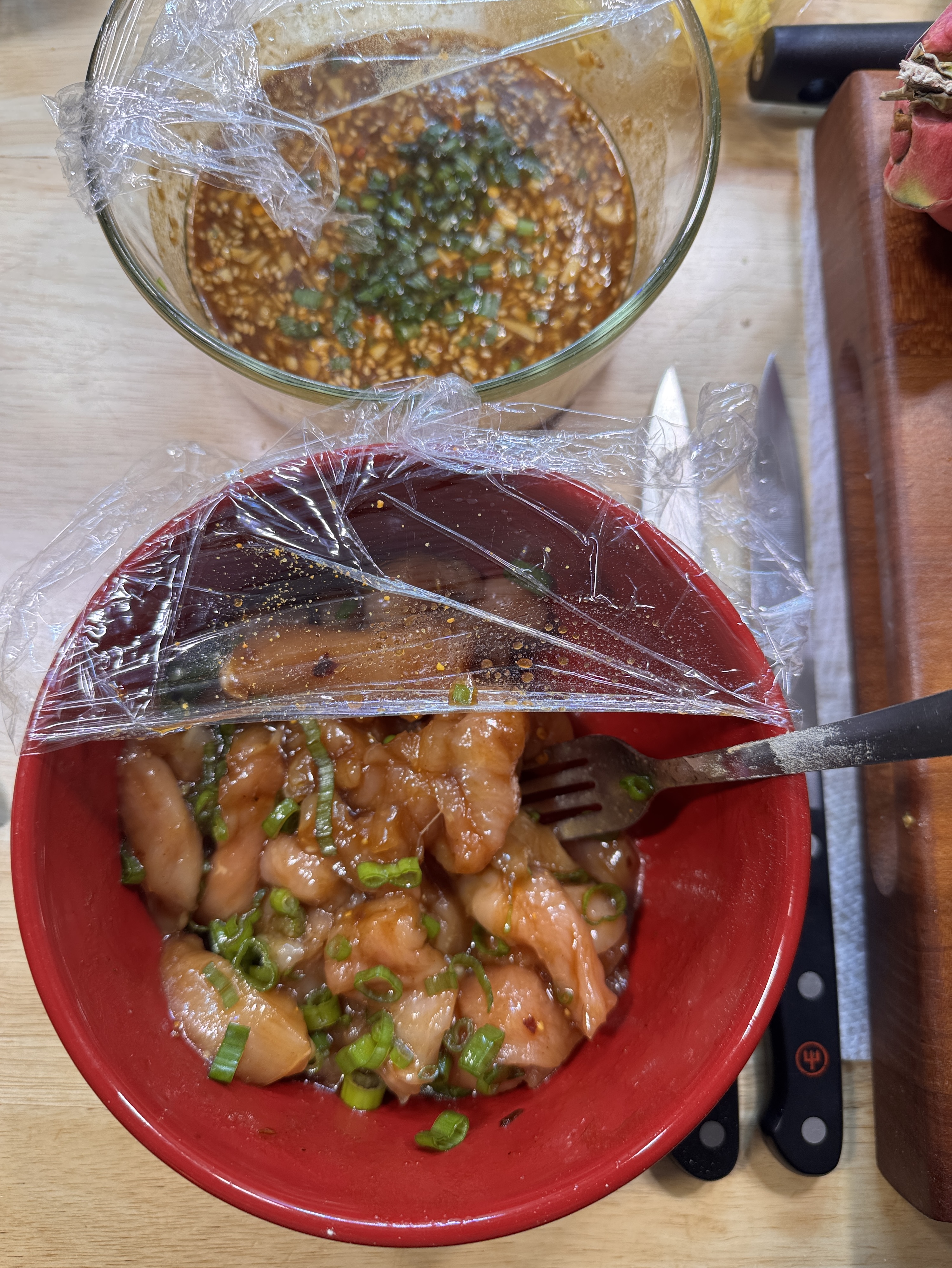>>21985020scallions in, some sauce into the chicken to marinate, back in the fridge to rest