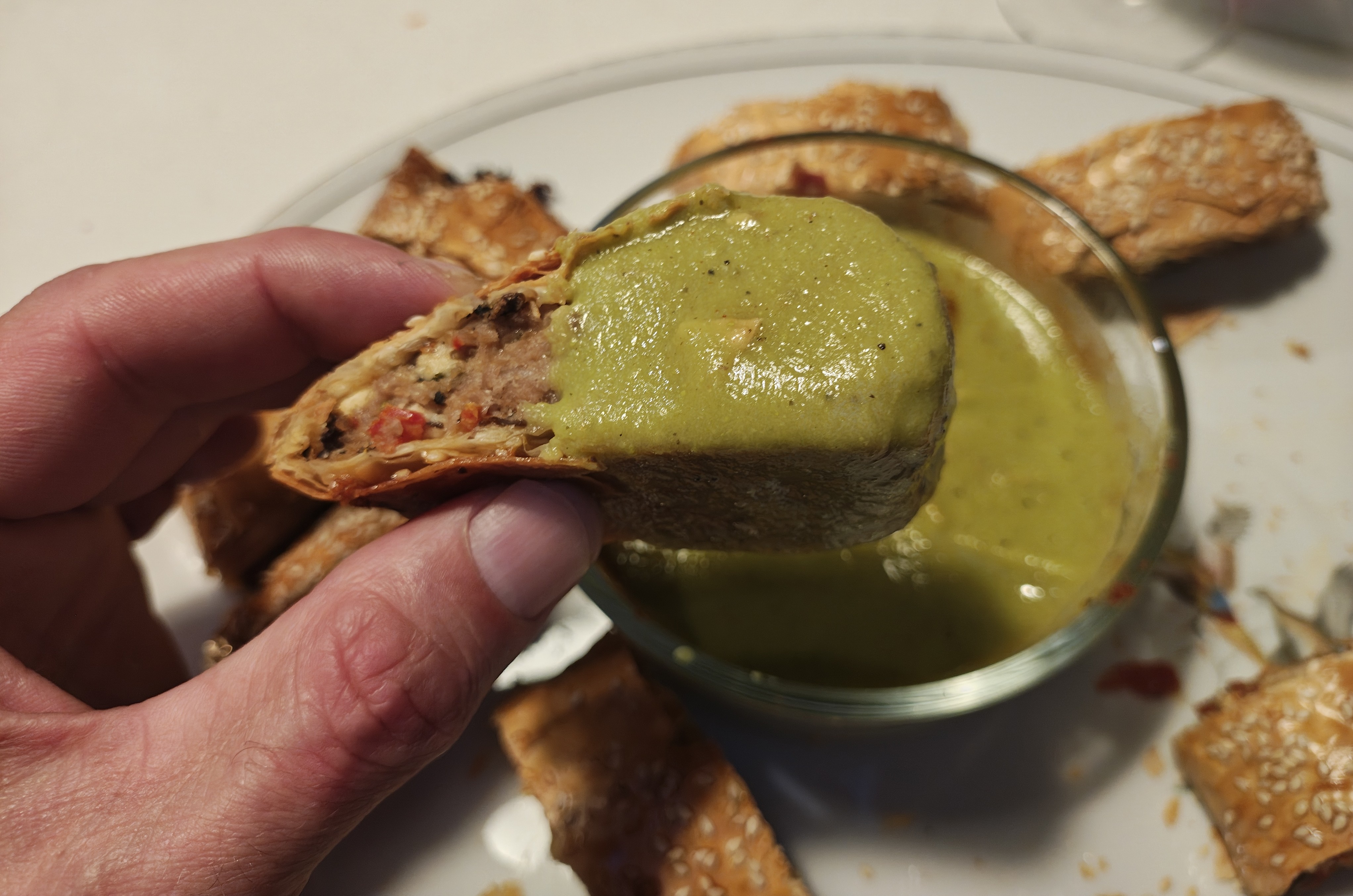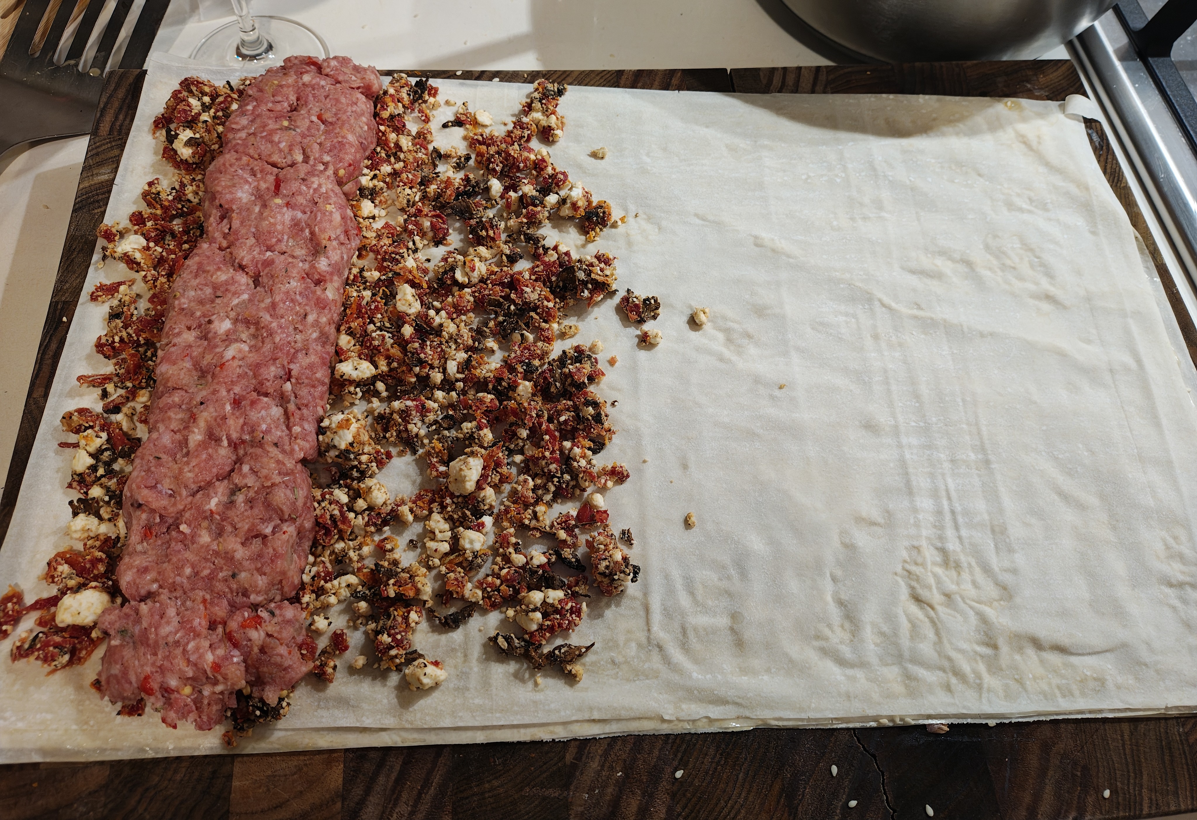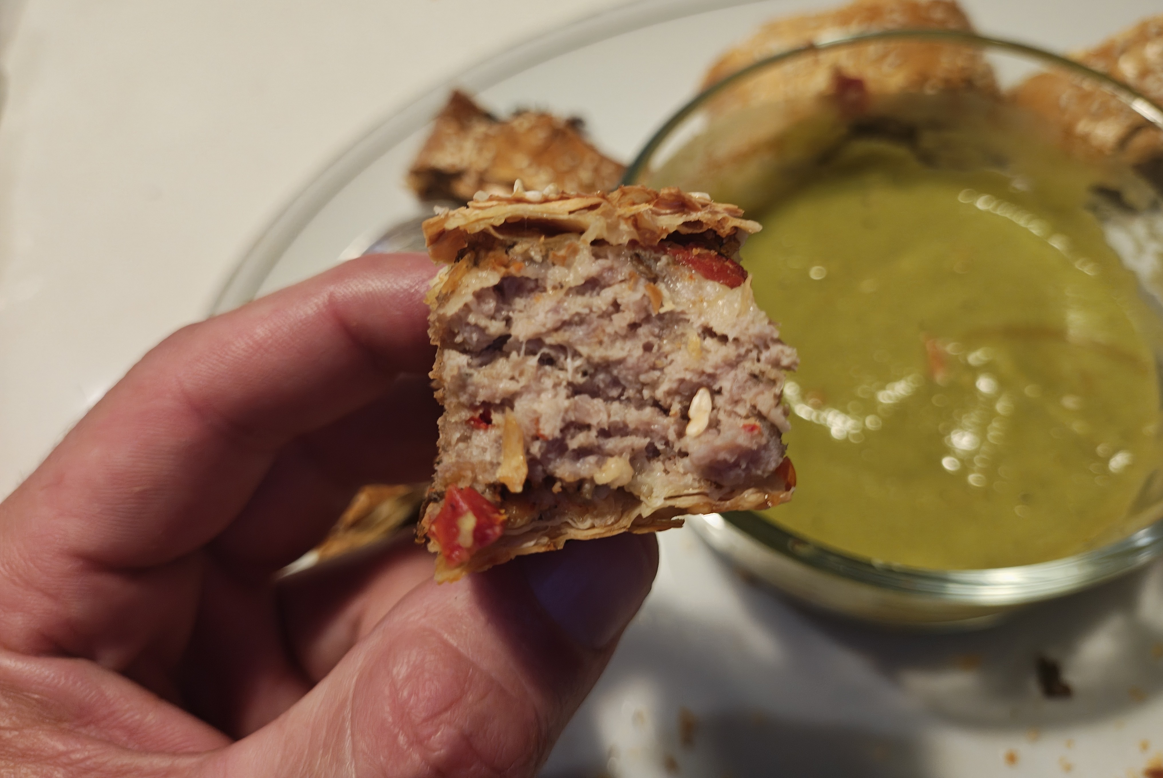 Freestyling some filo pastry chilli sausage rolls with a mushroom, sun-dried tomato, feta and blue cheese duxelle and a pea soup dip.