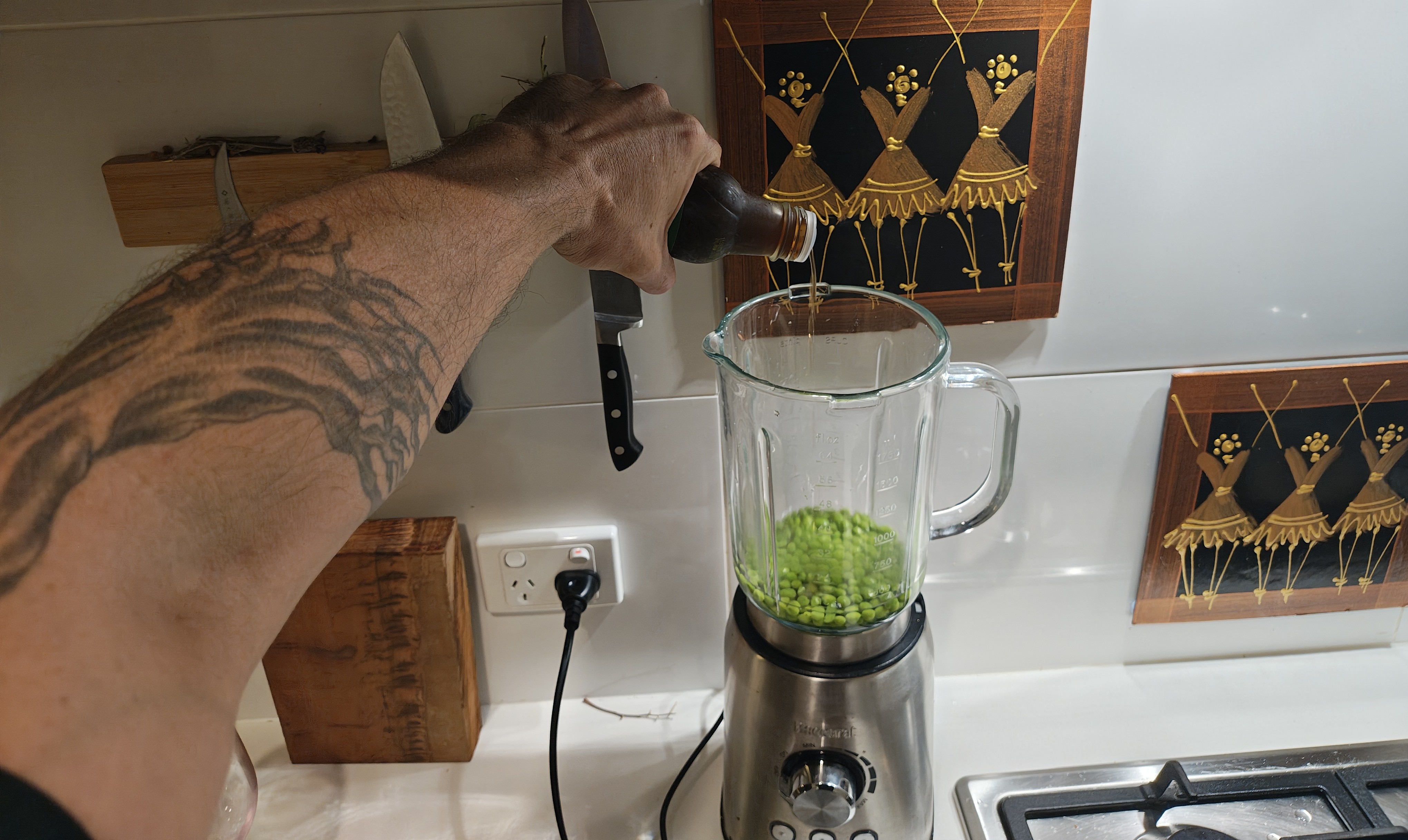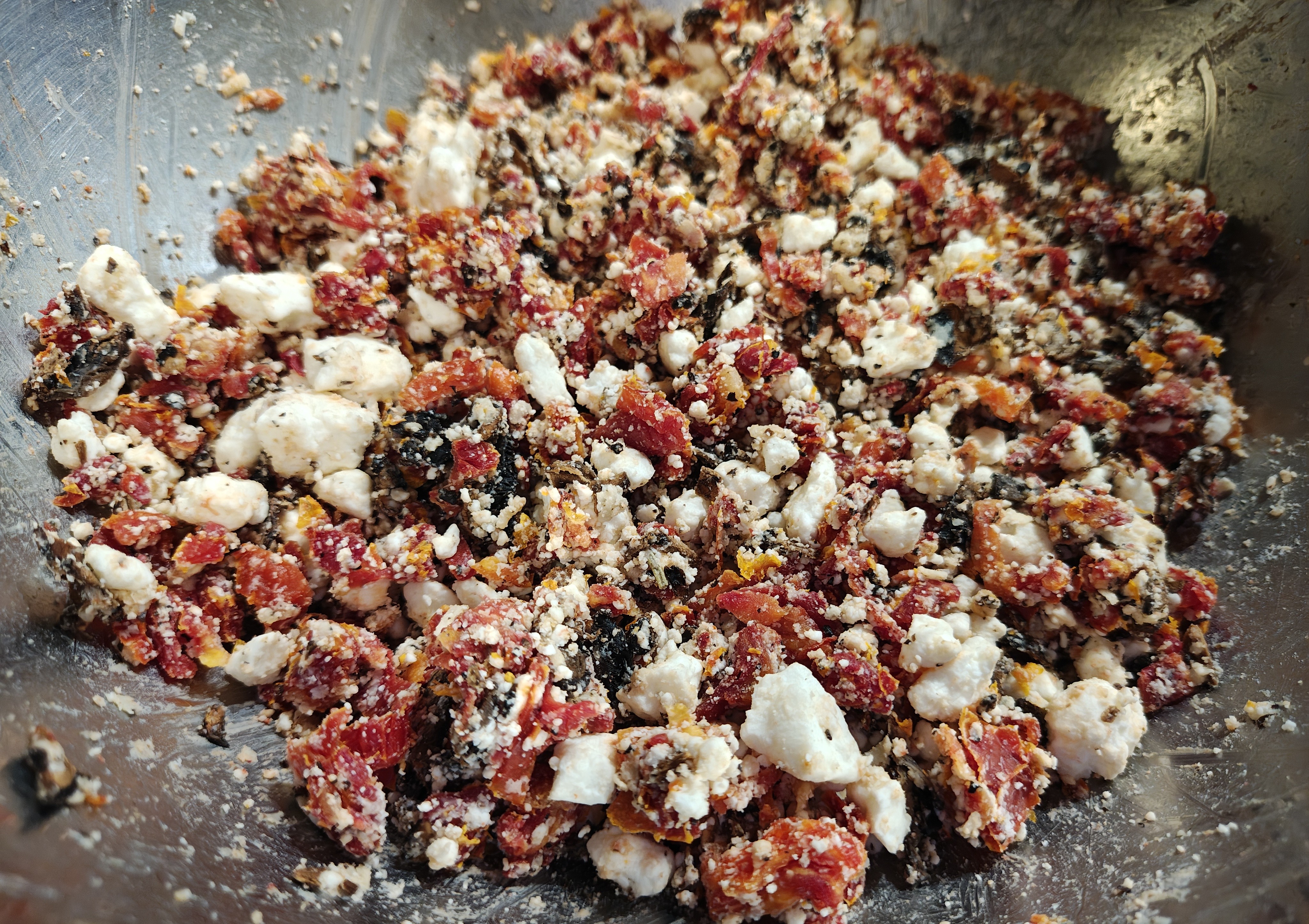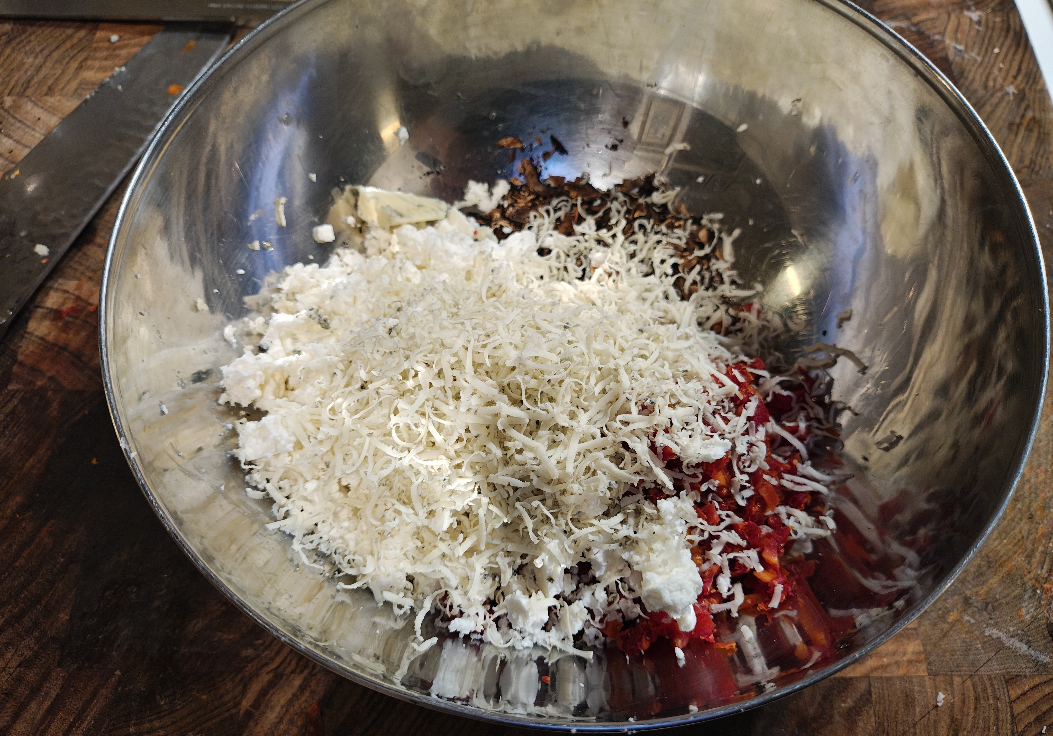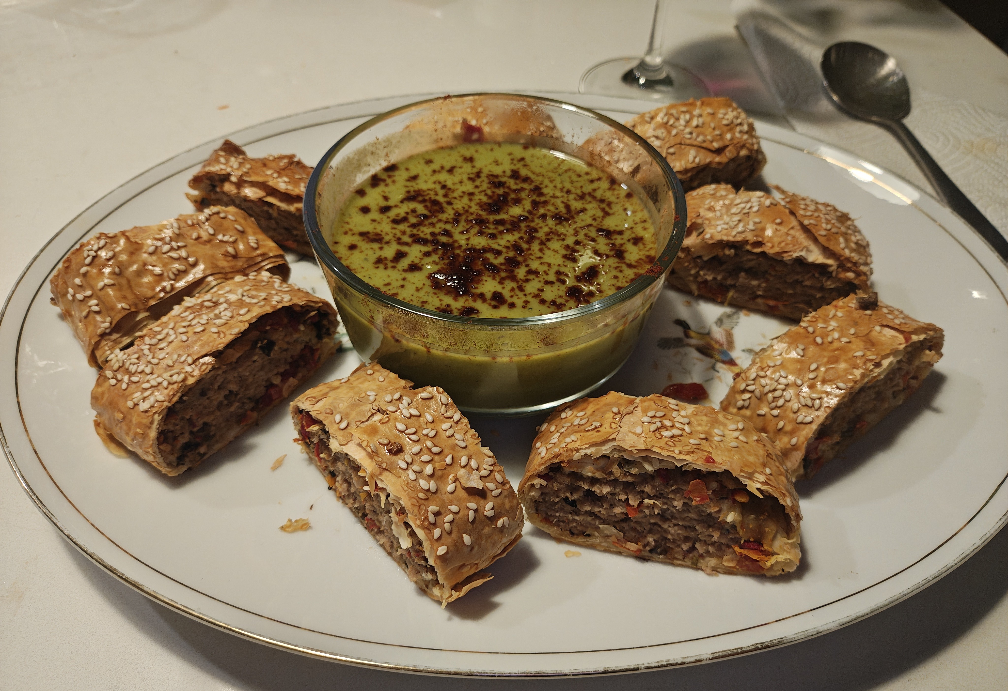 Freestyling some filo pastry chilli sausage rolls with a mushroom, sun-dried tomato, feta and blue cheese duxelle and a pea soup dip.