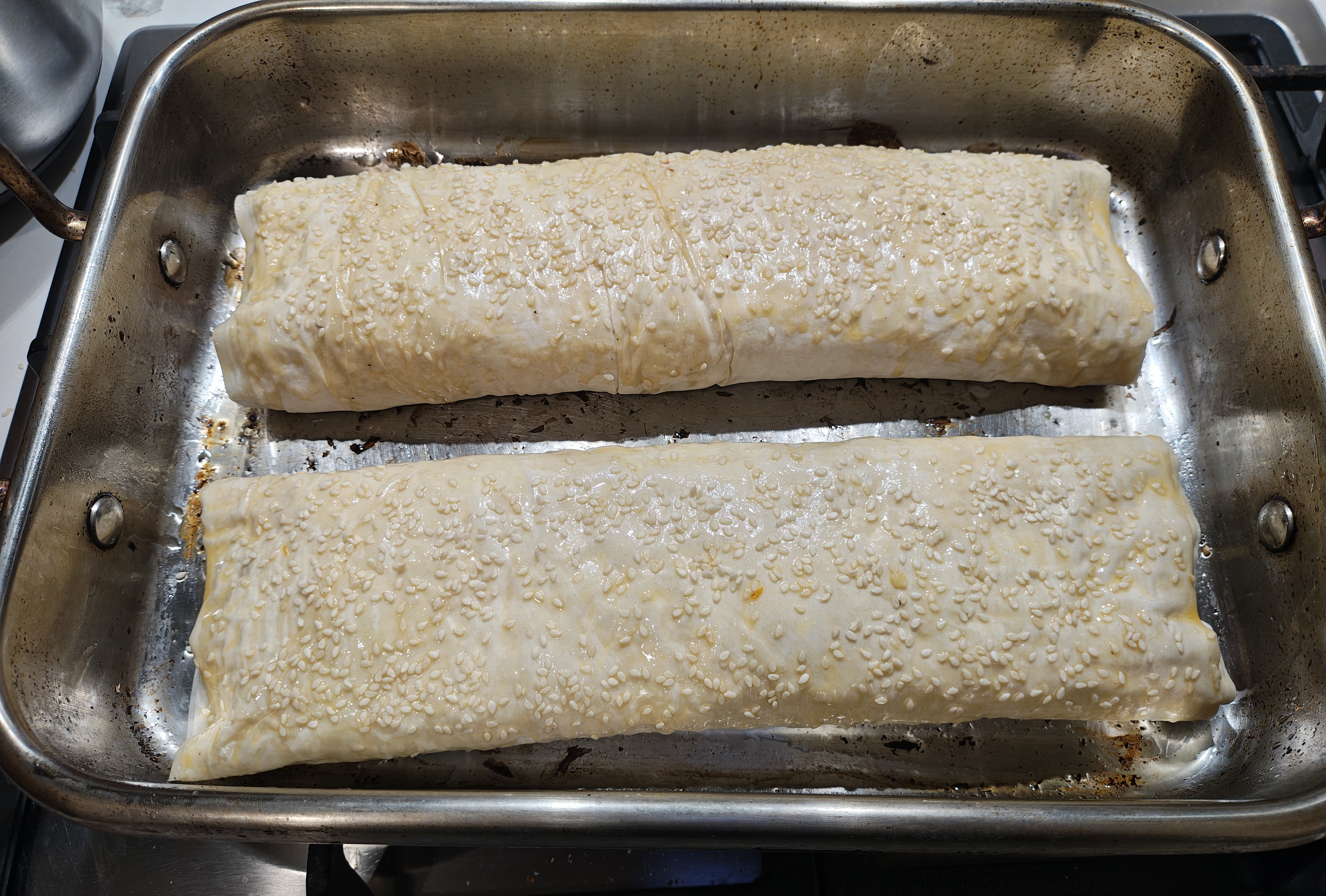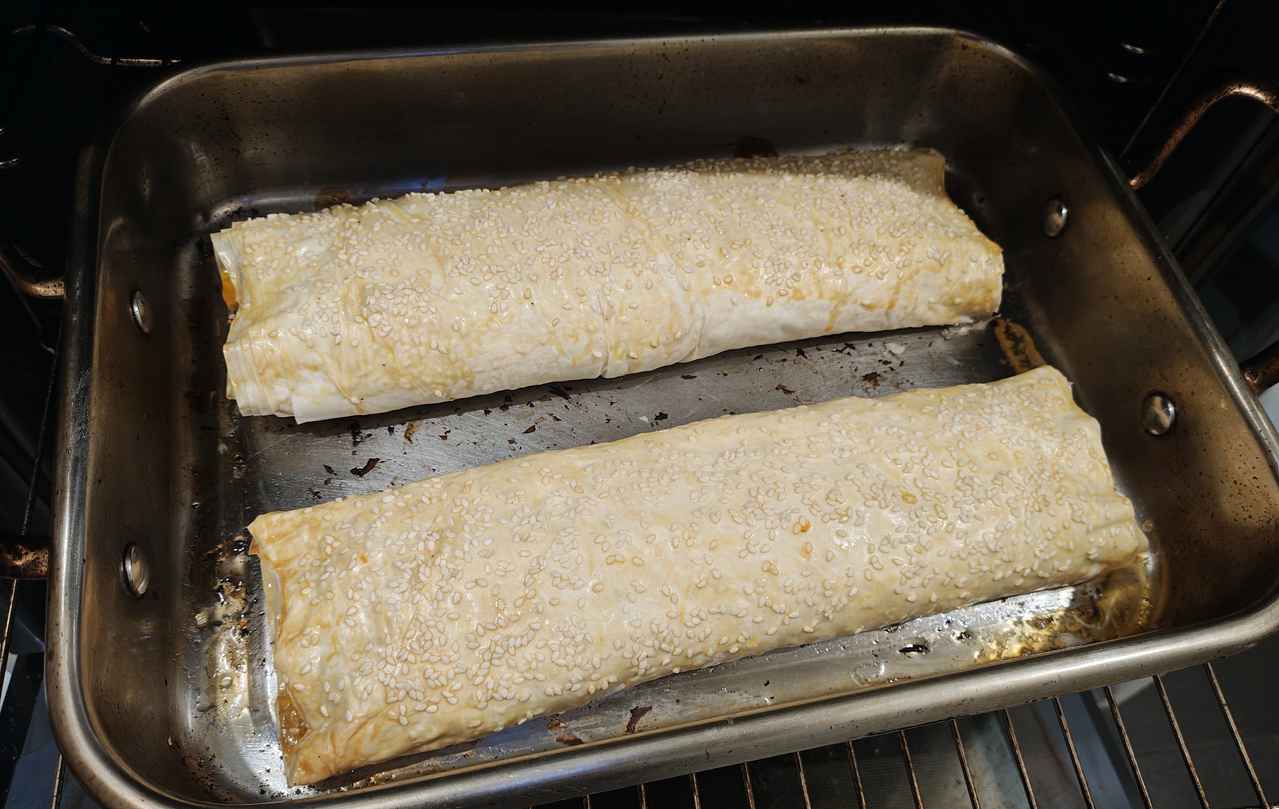 The sesame seeds act as spacers, allowing air between the filo layers