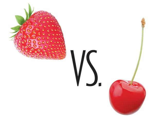 Cherry artificial flavor is not based on the flesh of sweet cherries but on benzaldehyde, which is found in the pit of wild cherries and bitter almond (cherry and almond are both stone fruits). This flavor profile was made in the 1800's to mimic maraschino liqueurs and is distinctly almond-like.Meanwhile strawberry has a more complex aroma profile with over 350 volatile compounds, making it harder to replicate.