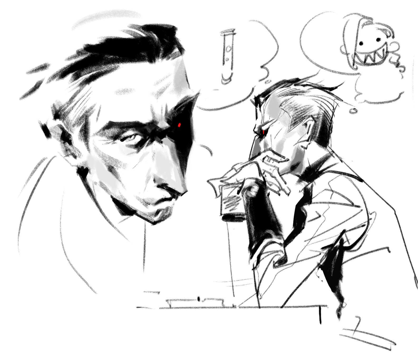 Two souls face each other in head to head battleA third sits awkwardly in the corner, doomscrolling on his phone.