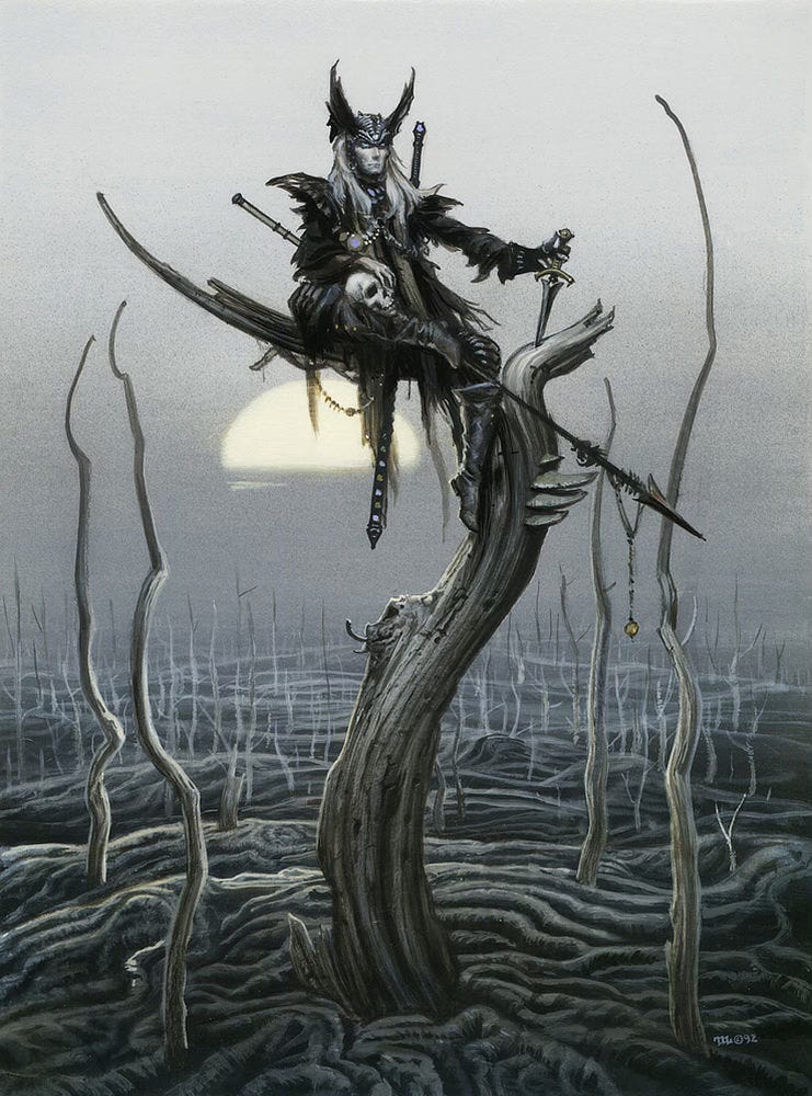 I've been obsessed with Elric of Melnibone by Micheal Moorcock. He's one of the earliest examples of a dark fantasy anti-hero, and an early inspiration for the bishonen aesthetic, in short he's the first gothic pretty boy. I love his writing style and moody prose it's all such a vibe.
