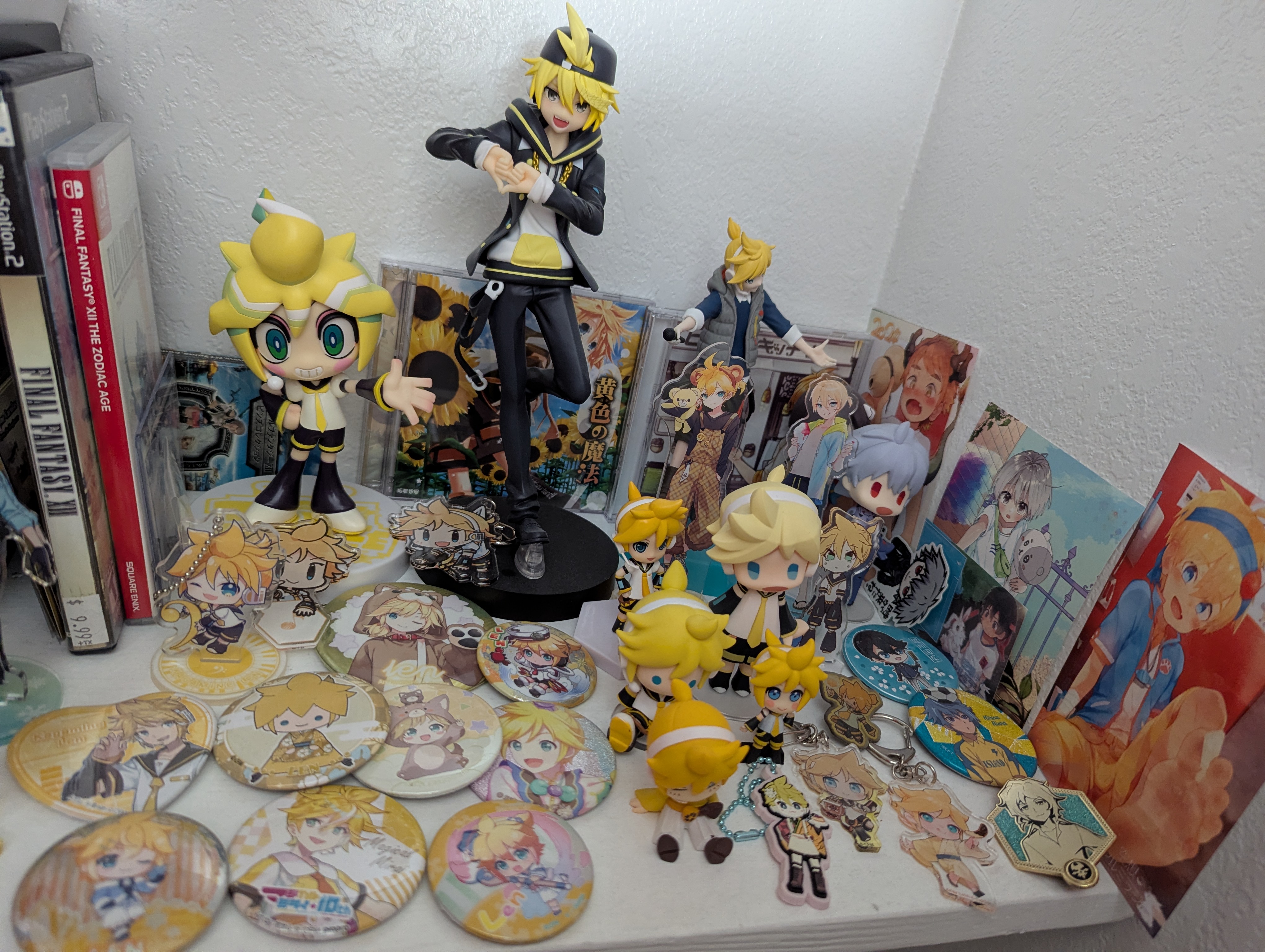 >>4012166It's mostly Len since he's the only sho to regularly get merchandise. Not pictured is a life sized wall scroll of him undressing (really kills me that I can't wake up to that every morning). I try to collect other shos when I can but they're much rarer, like I have a near complete set of Larsa Solidor cards from the Final Fantasy TCG, and some Pokemon ones as well.