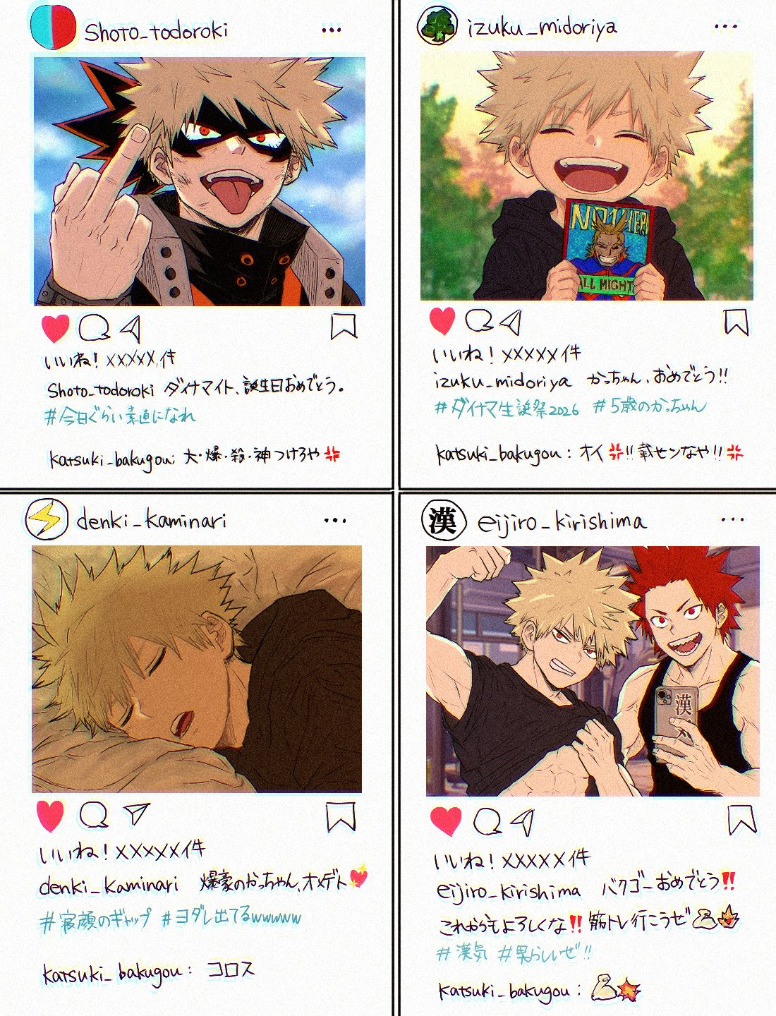 >>4033518>Todoroki: Happy birthday, Dynamight. #BeYourselfToday>Bakugou: Use the "Great Explosion Murder God">Midoriya: Congrats, Kacchan! #DynamightBirthdayParty2026 #5YearOldKacchan>Bakugou: Hey!! Don't upload that!!>Kaminari: Grats, Kacchan Bakugou #CuteSleepingFace #SomeDroolCameOutLOL>Bakugou: I'll kill you>Kirishima: Congrats, Bakugou! Let's stay friends! Come work out with me! #Manliness #Manly>Bakugou: [muscle emoji]