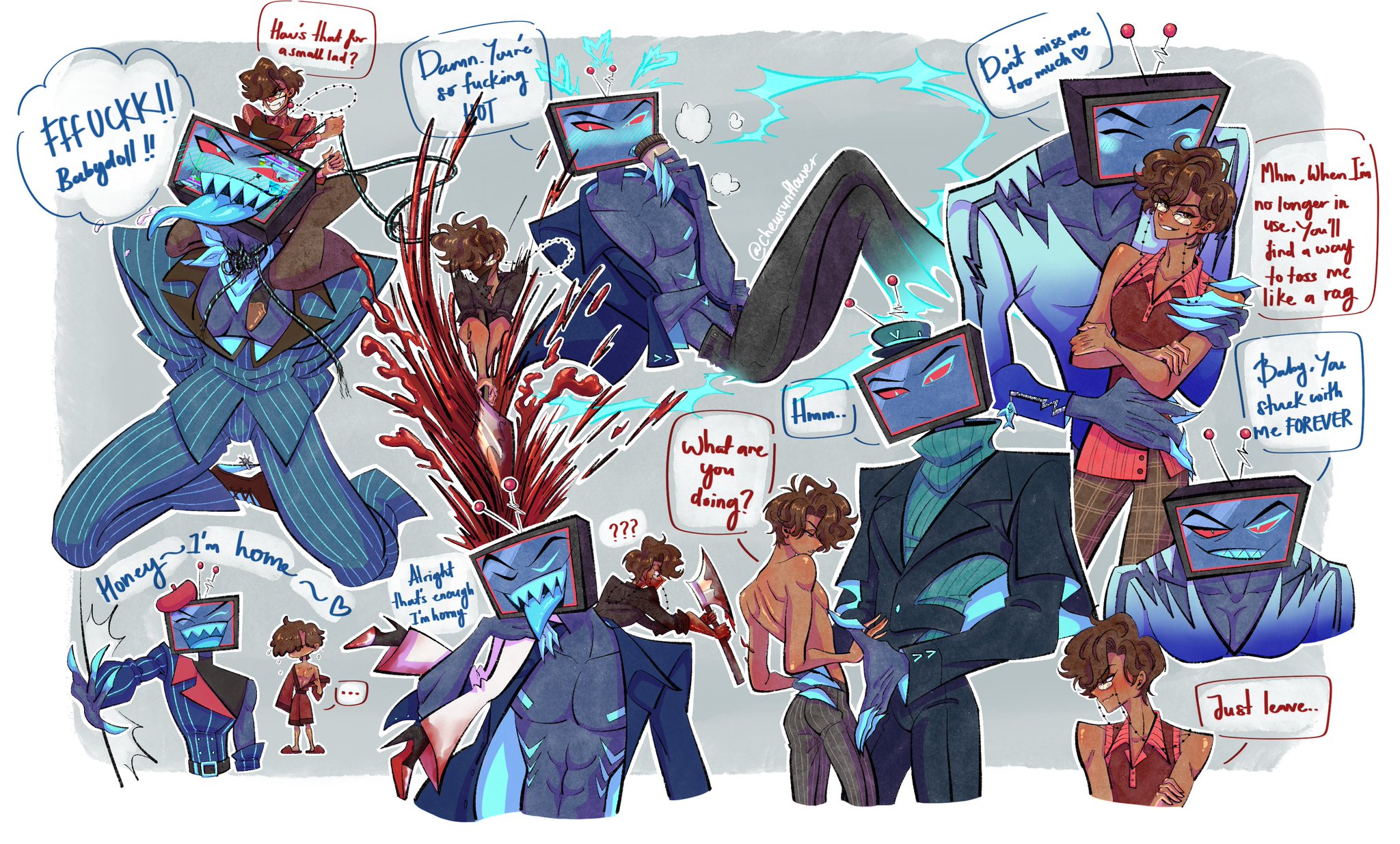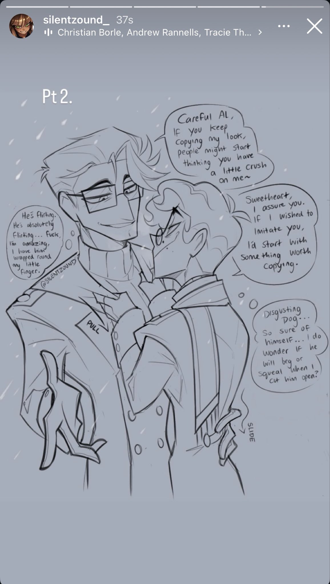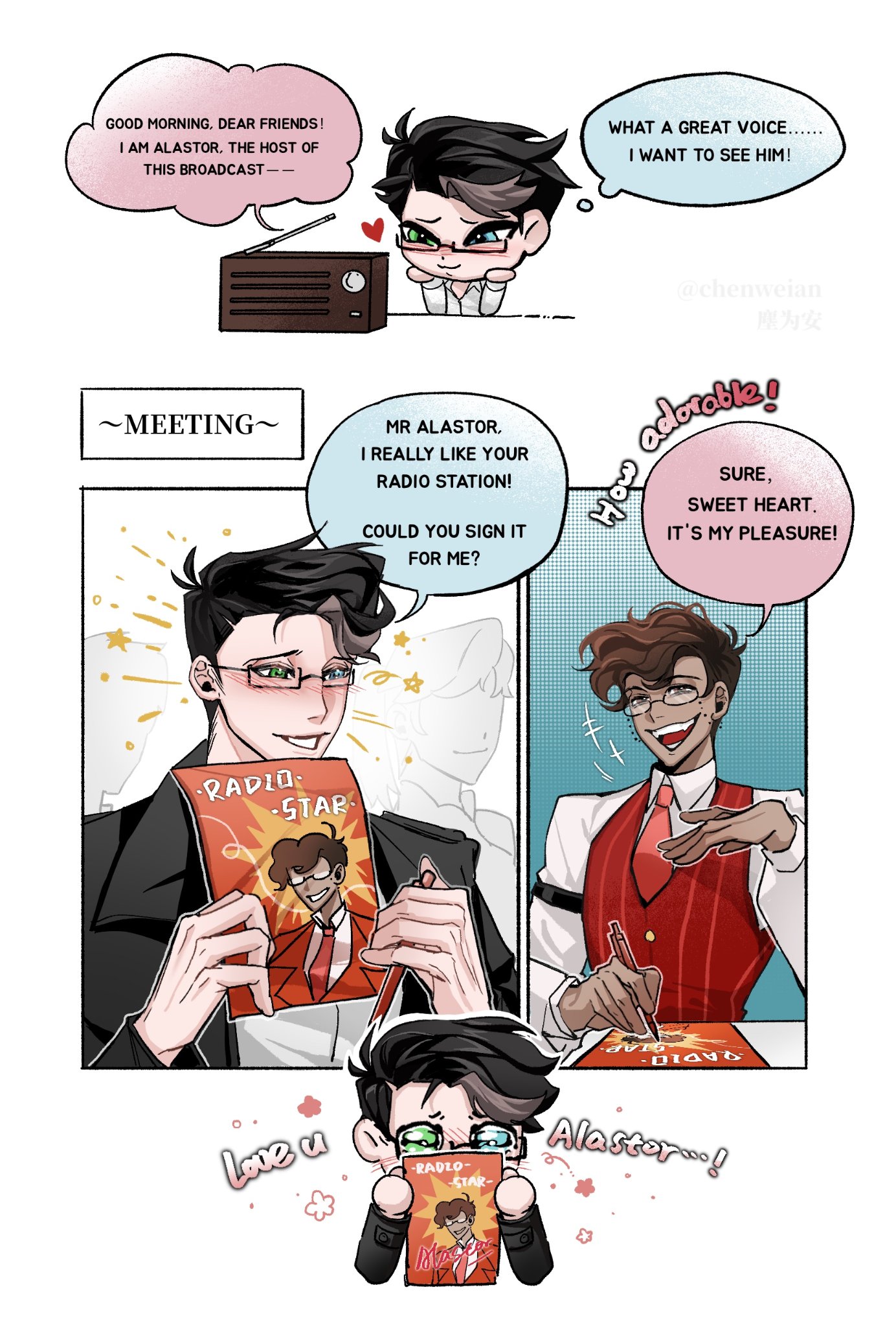 I’m not the biggest fan of Amir but him, Christian, and Tia are carrying hard right now because anytime any of them post or say anything radiostatic related we get a new flood of fanart. As disappointing it is that anyone in charge at Spindlehorse refuses to make almost any merch with Alastor and Vox even in the same picture at least they’re making up for it.