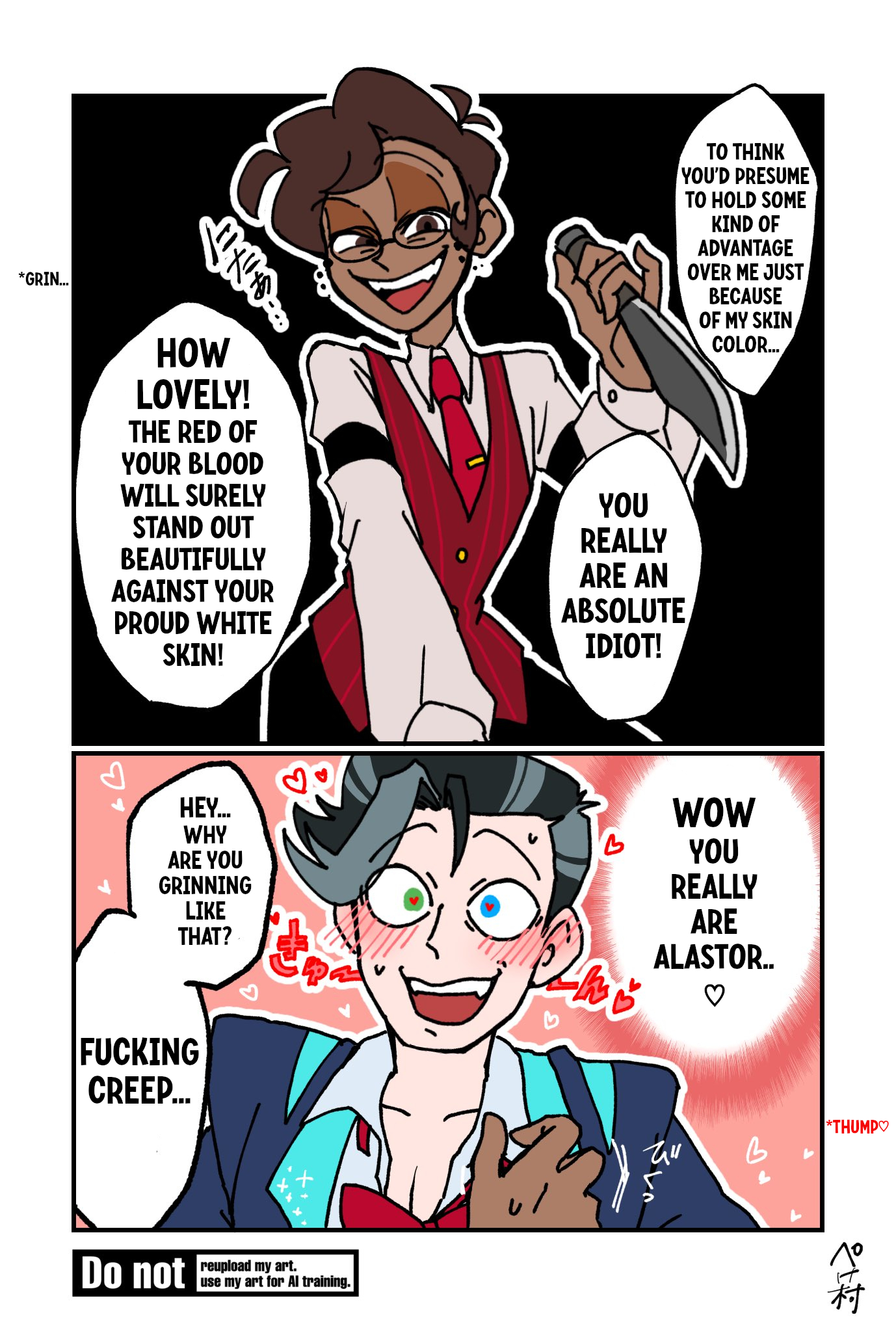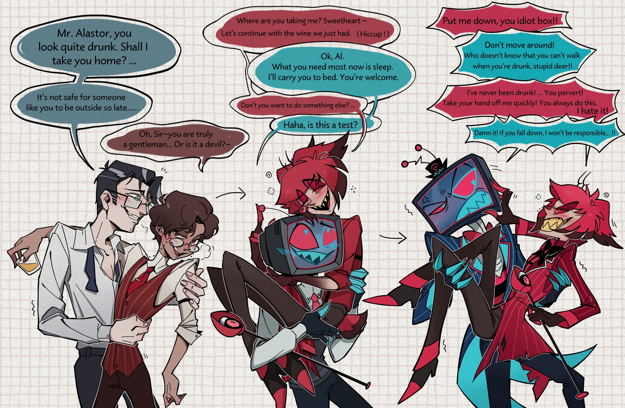 I honestly can't narrow it down, my heart goes wild at any genre with the two of them together. I think my absolute favorite might be Alastor/CRT fluff though