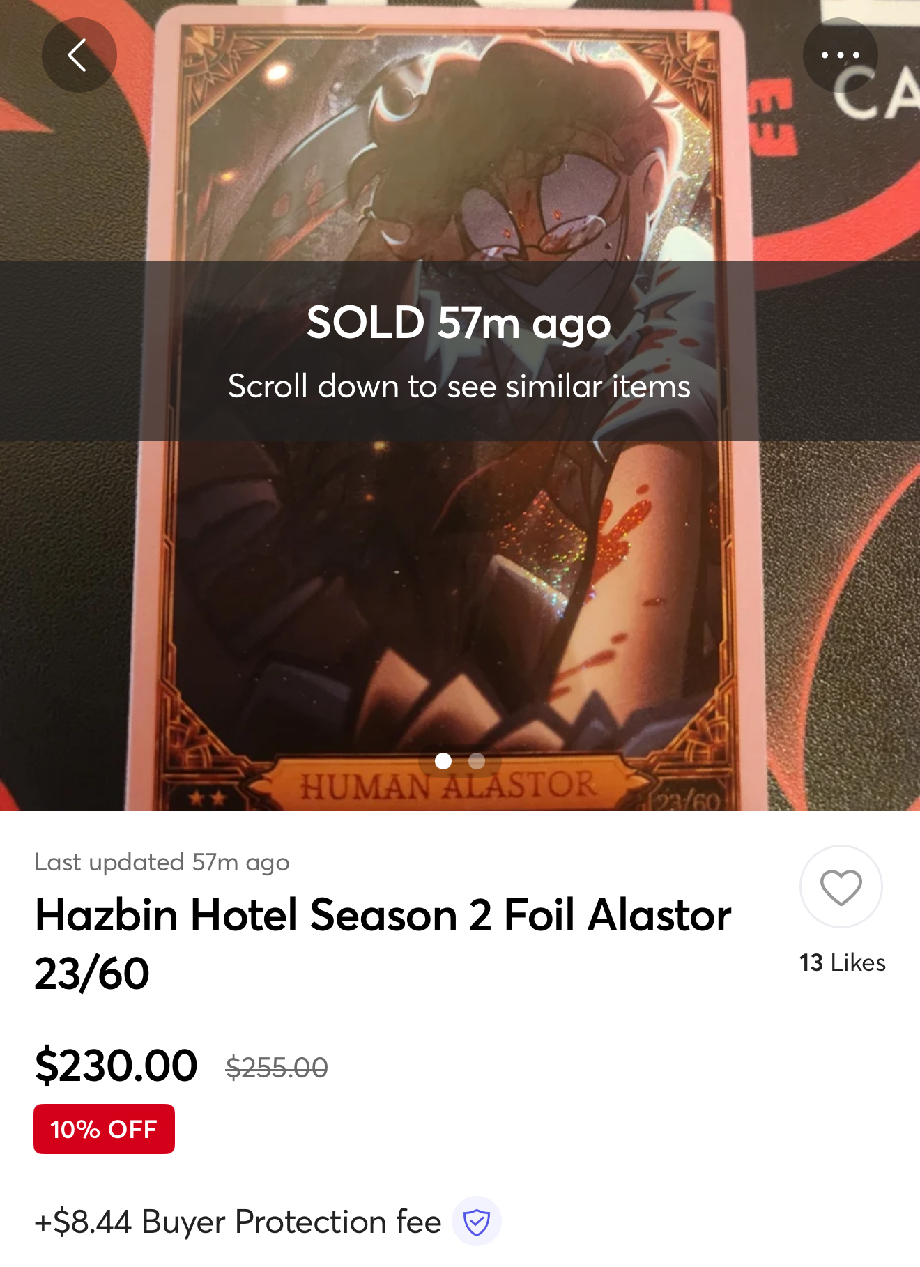 >>4023713I doubt I'll get The Offer but it's fun to cope about it. That's why I say I have all the Alastor cards, the odds of pulling that are so astronomically low. I'd be happy with any secret rare though, they're all beautiful. (well maybe not the roach, but that one's funny, so it's still cool) To be honest, my offer from before still stands, if I get another NF Human Al, you're welcome to him. I'm not that fussed about the resale value, I made my money back for the first editions from like 2 cards, and I accepted offers on both of them. Someone offered me less and I would have accepted, but they kept changing what they wanted and it pissed me off.
