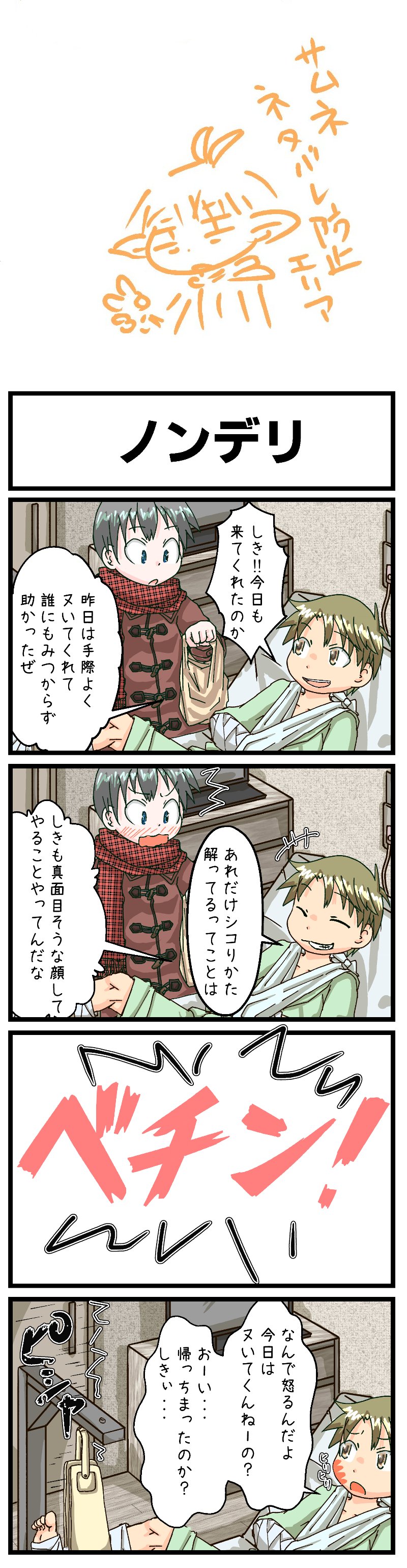 >>4023069Full comic + translation:>[author's note] Sneak peek. Beware of spoilers.>[title] Non-Delivery>Shiki! You came again today.>Thanks for jerking me off without anyone finding out. Saved my ass. Yesterday you did it so smoothly.>The way you know how to jerk me off like that means even though you look serious, Shiki, you're doing this stuff too.>[Smack!]>Why are you mad?>Aren't you gonna jerk me off today?>Hey... Did you leave already? Shiki...