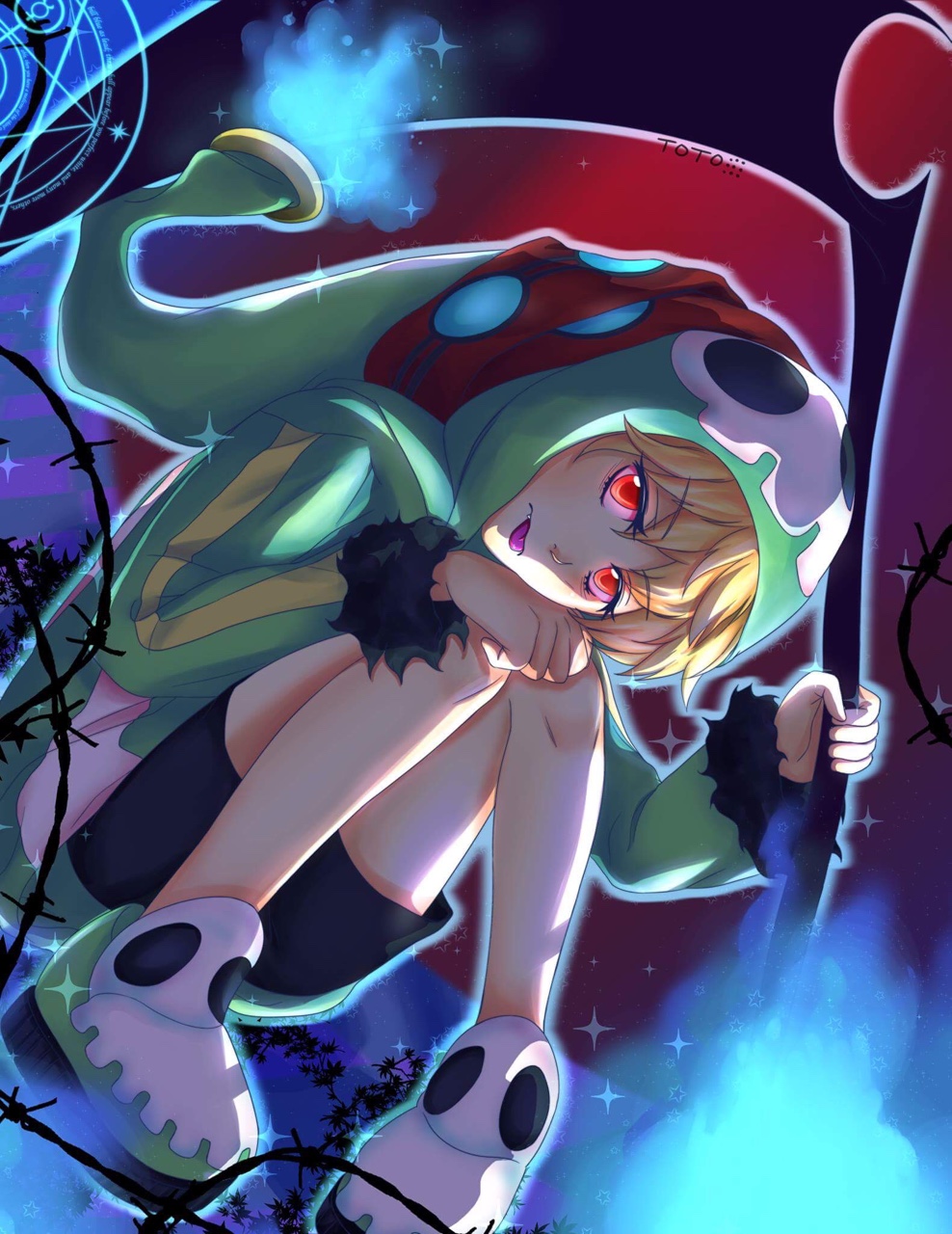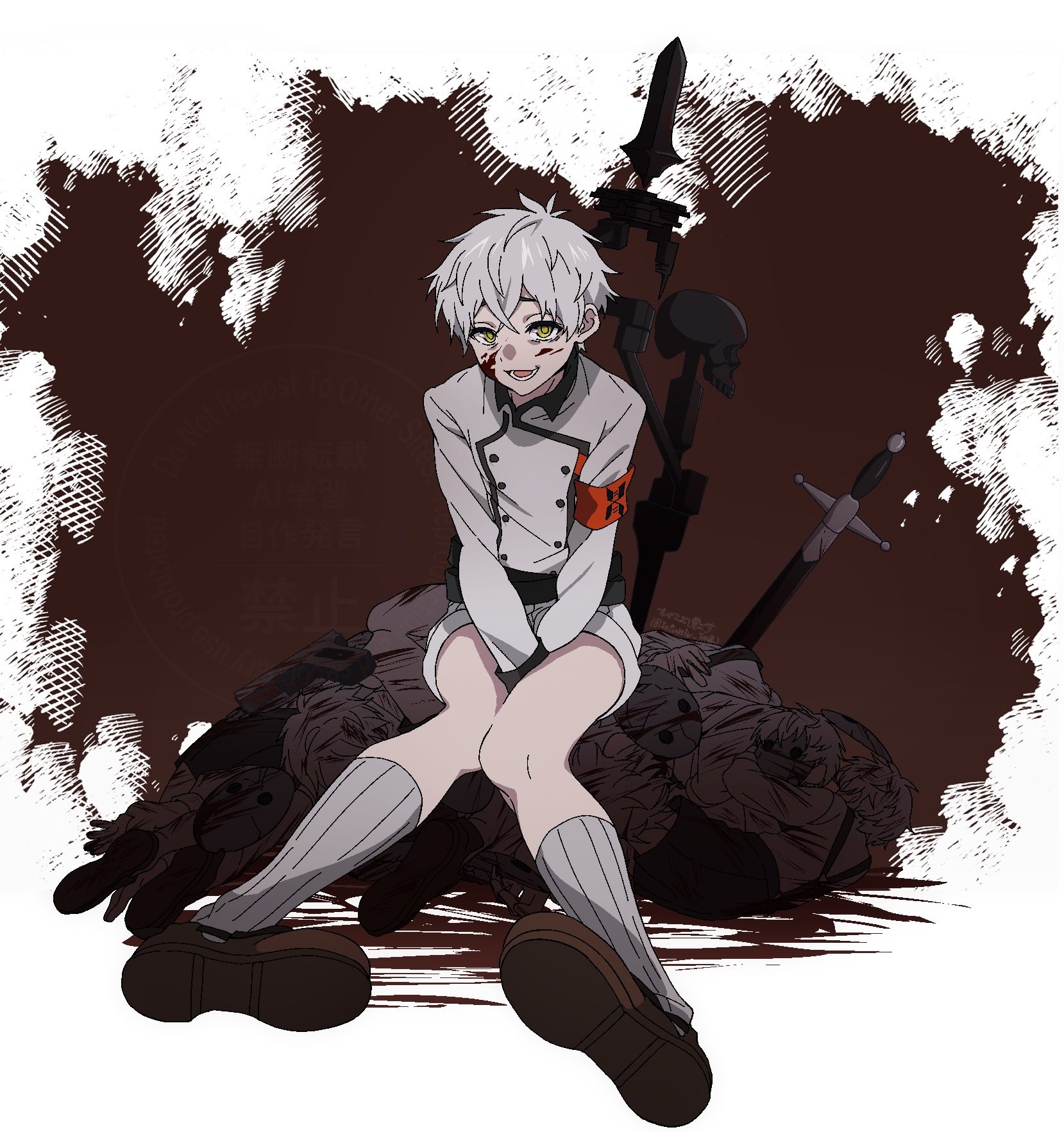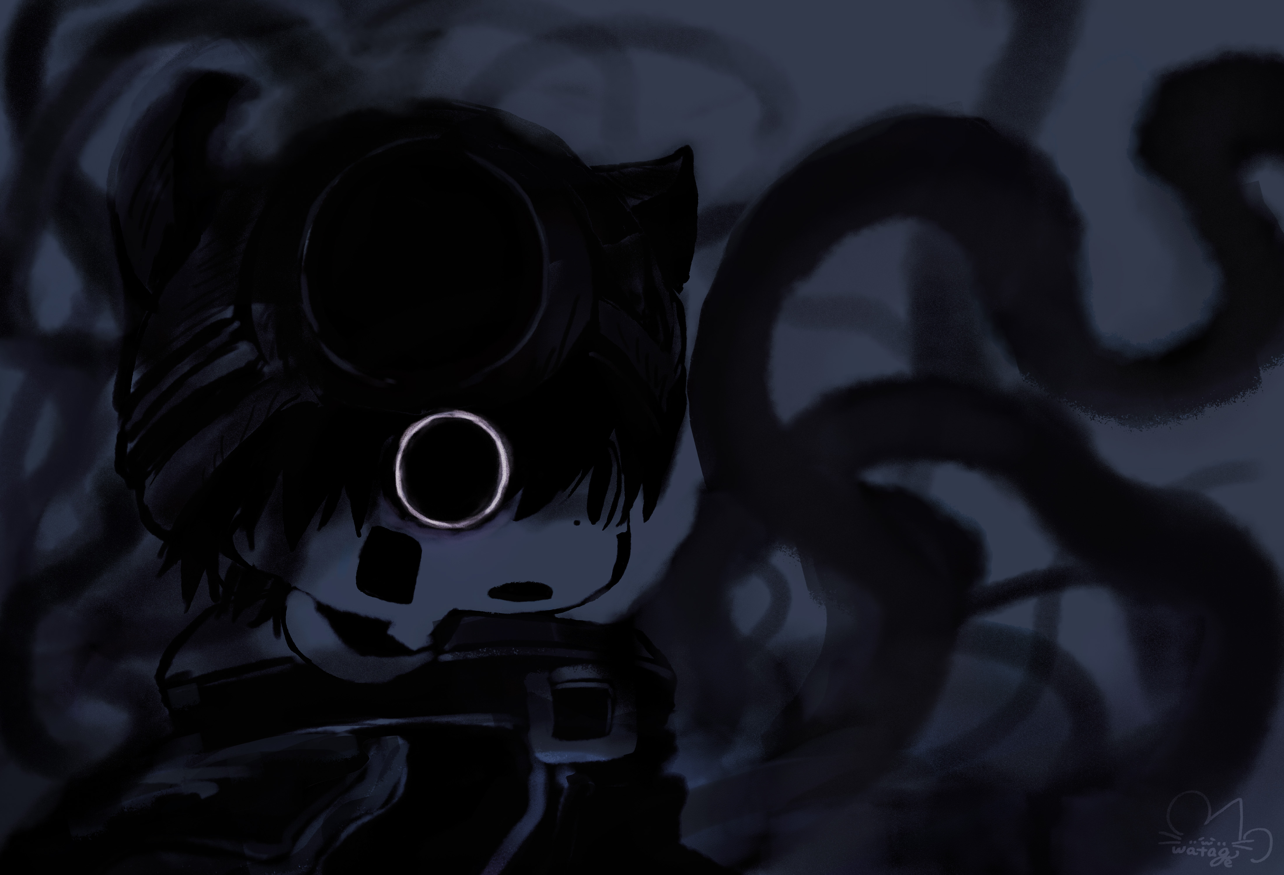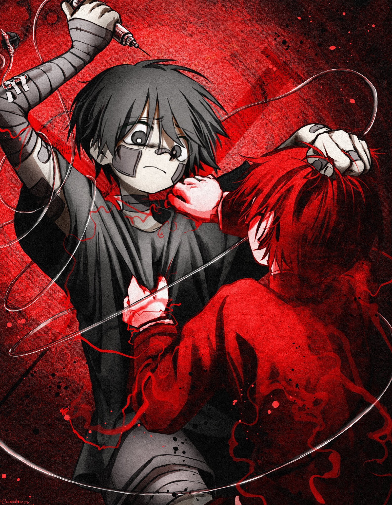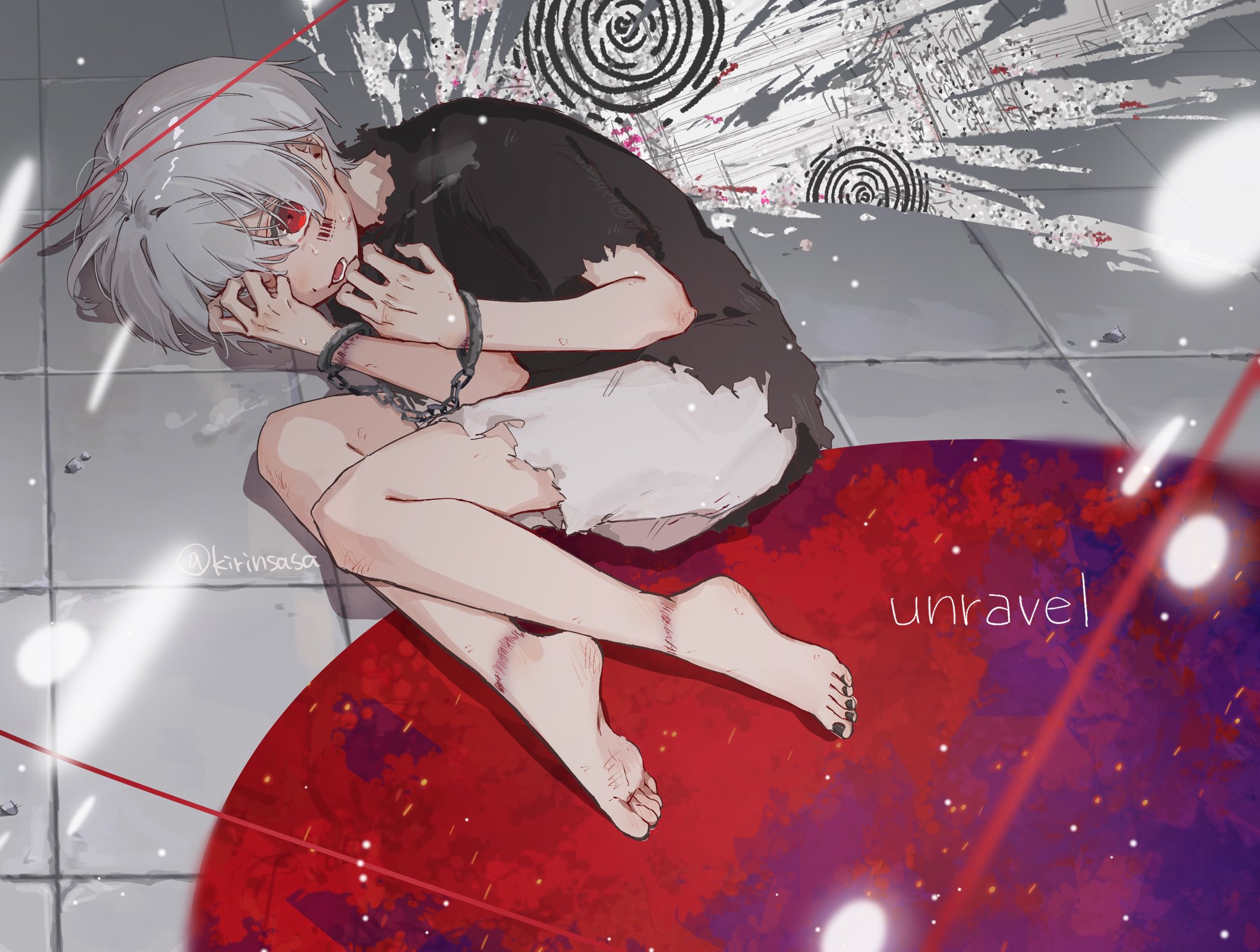 >>4025249Yep. The perverted brat in desperate need of correction.>>4025254That is the art for Mafumafu's cover of the Tokyo Ghoul OP. The red eyes and barcode (and white hair) are features of his avatar that he uses in all his music videos. I don't know if they represent anything. The rest is from Tokyo Ghoul. Like the wings are a reference to the main character's wing-like extra mutant ghoul appendage thingy.