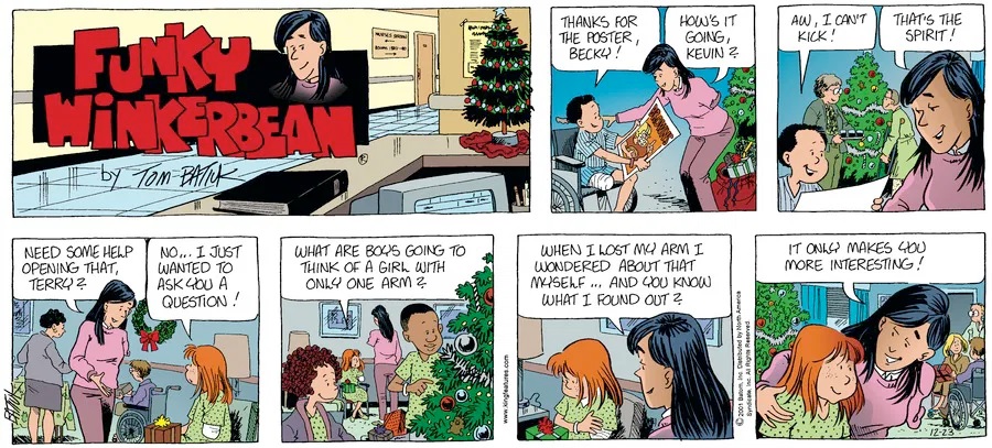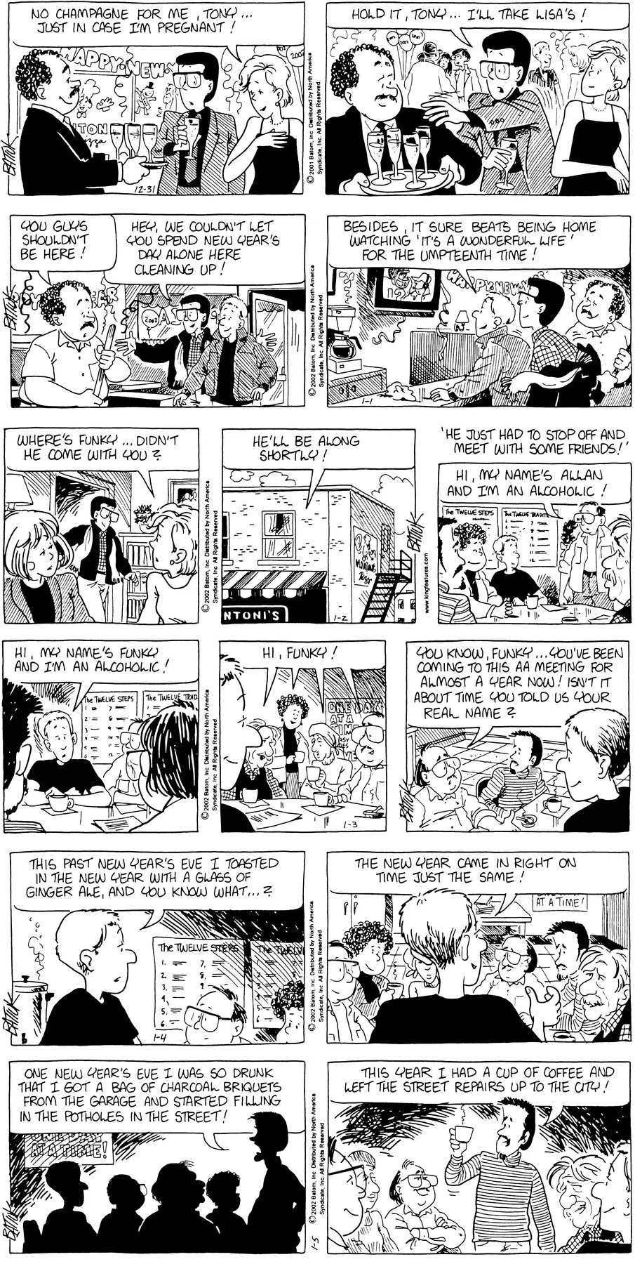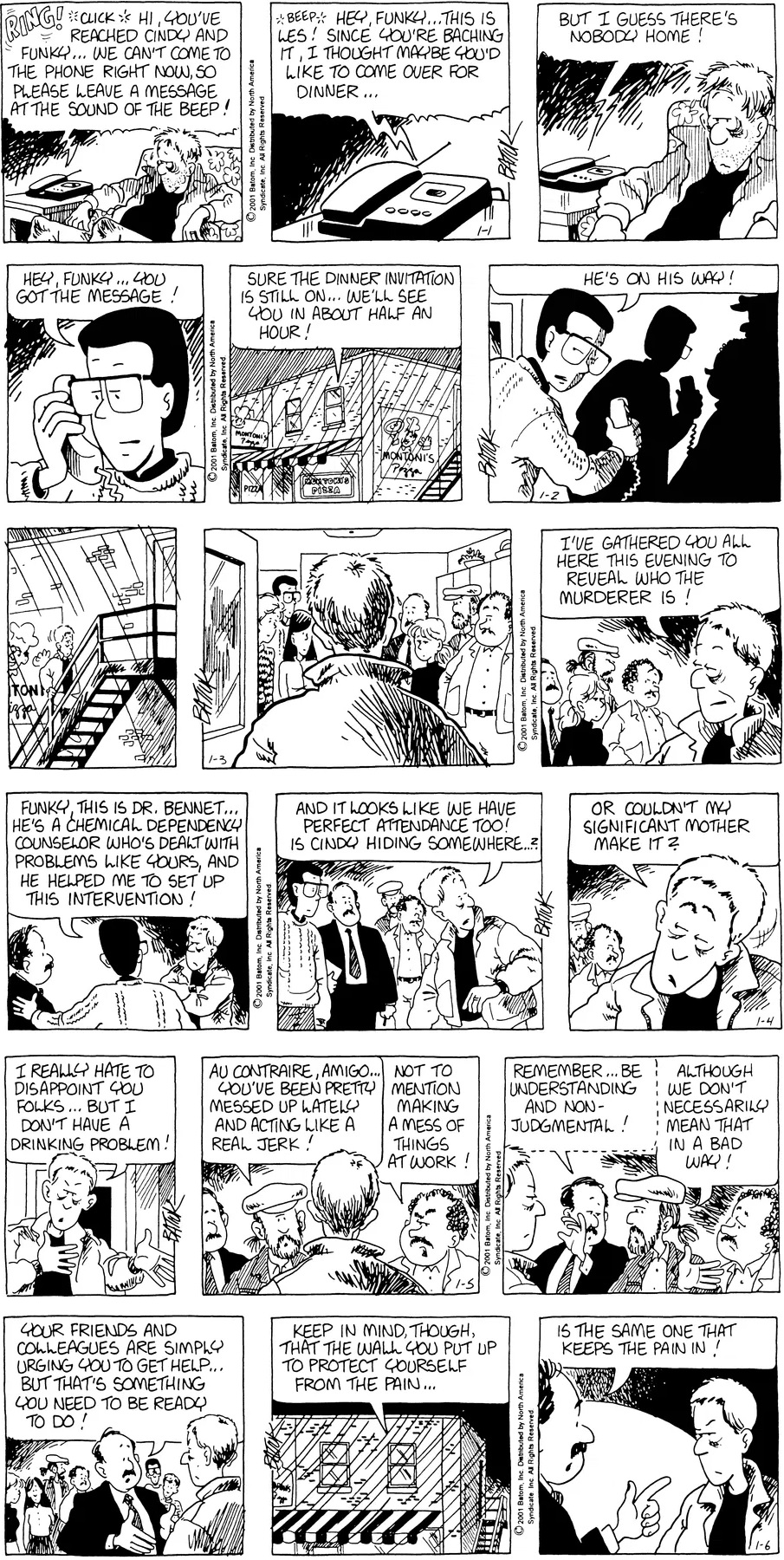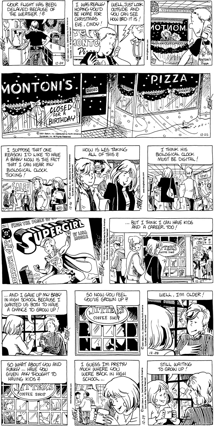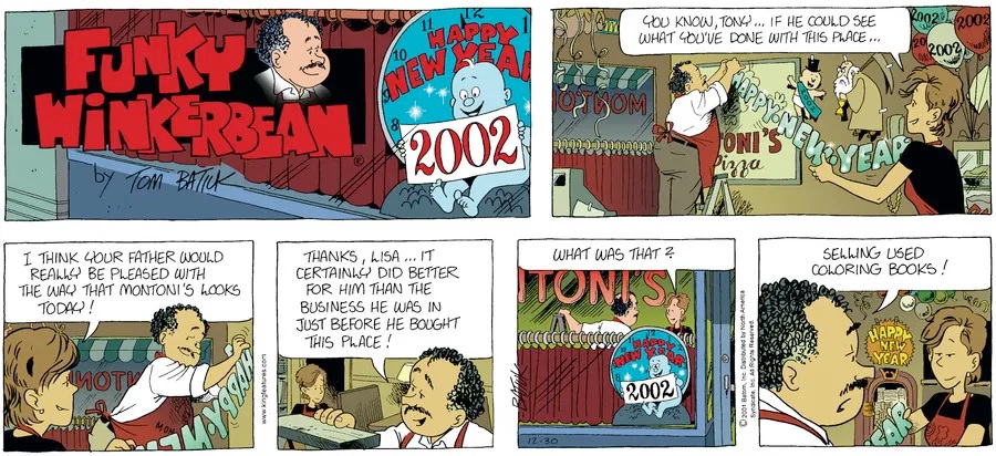 Previous >>151671718Today will cover 2001.Last time, John hired a new girl named Rach to work at the Komix Korner but being unable to pay her let her go where she subsequently got a job at Mononi's while Darin also took a job at Montoni's. Chien caused some problems with articles in the school paper first about the strictness of the school's new dress code and about bullying issues while Bull led the Scapegoats to their first legitimate football championship. Lisa discovered tha she had breast cancer though with chemo, a mastectomy and support from her friends and family, including former majorette and fellow breast cancer survivor Holly Budd, she was able to get through it as the cancer went into remission.But things weren't going well for Funky. His marriage to Cindy was beginning to fall apart as her career began to take off as she was given a job offer for ABC News in New York. Funky turned to alcohol to cope with the stress which turned into a problem when Cindy got the wrong idea after Rachel brought him home, he missed her flight and ended the year passed ou on the sidewalk in front of Montoni's.