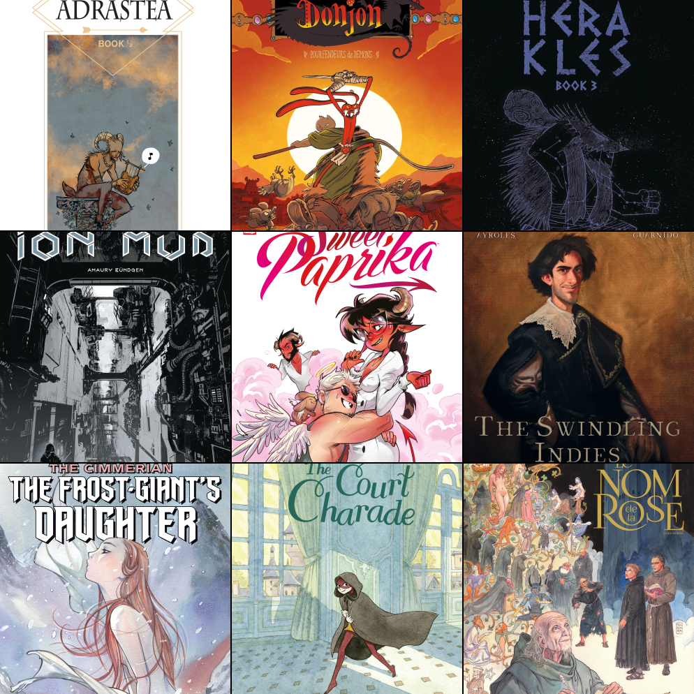 >>151960545ADRASTEA, by Mathieu Bablet, July 12, 2022 - a more traditional mythic tale compared to Bablet's earlier Shangri-La and disappointing Beautiful Deathdonjon Pourfendeurs de démons 2021 - Donjon is always a good laughHerakles by Edouard Cour 2020 French 2015 - I liked the style - it better depicts the madness and violenceIon Mud 2021 - maybe a bit style over substance but it worked for meMirka Andolfo's Sweet Paprika 002 (2021) - always a good readSwindling Indies (Les Indes fourbes 28 Aug. 2019) by Alain Ayroles and Juanjo Guarnido; scanlated 2021 https://desuarchive.org/co/thread/120466576 - best of the decade for meThe Cimmerian - The Frost-Giant's Daughter art by Robin RechtThe Court Charade 2022 - light hearted tale from kerascoetUmberto Eco's Name of the Rose 2023 https://desuarchive.org/co/thread/140211906