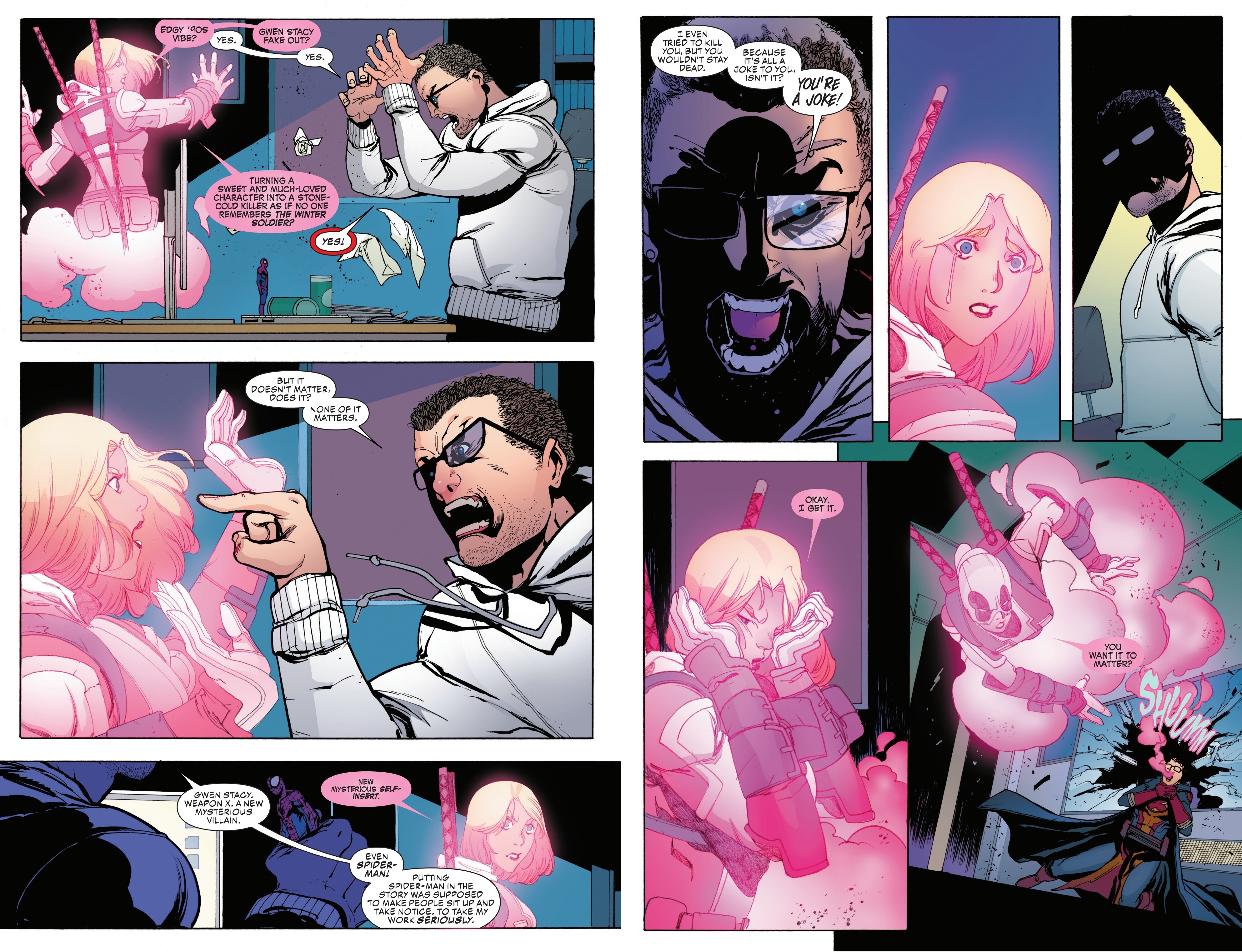 >>151947383It mainly revolved around a fake-out 'resurrection' of Gwen Stacy. The REAL Gwen Stacy this time, for realsies it wasn't, it was another clone who would be brought back with Deadpool's healing factor and thus make her a genuine 'Gwenpool' as a dark counterpart to the original Gwen Poole. Stacypool kills Poolepool by accident, Gwen comes back as a ghost because death doesn't matter in Marvel, she seeks revenge on Stacypool, both realize everything is really acting out of character and is getting really dark/gritty all of a sudden for no reason and realize the bad guy who cloned Gwen Stacy this time was literally the writer of the story who was mad at being forced to write for Gwenpool and intentionally wrote a lot of stuff OOC on purpose trying to 'fix' her because she doesn't take things seriously enough.It's about as bad as it sounds. Gwen's still had worse runs, it's not without its moments and the premise of Gwen fighting her own author is a cool idea on paper but it requires someone more clever than this to pull it off. As is it's another case of a writer trying to justify everyone acting retarded by providing a twist explanation for it but it does not change that 4 out of 5 issues has everyone acting obnoxiously ooc beforehand. Not to mention it's a lesson Gwen already learned years and years ago by the end of Hasting's run that everyone seems to keep forgetting.