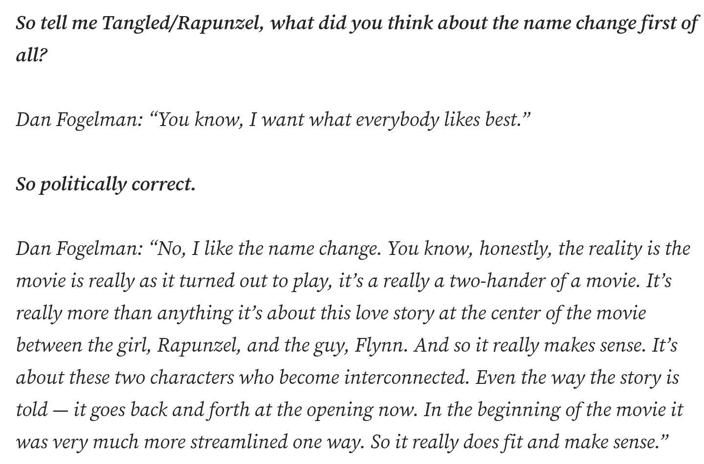 >>152114182Politically correct can be a buzzword thrown around a bunch today, but in this case the interviewer is using it in the context of “appealing to everyone”. The writer had the title of the movie changed from what they originally intended (I assume “Rapunzel”) to “Tangled”, so instead of saying they’re not in agreement with that decision, the writer is tiptoeing around the question and being “politically correct” by saying whatever everybody likes. Hopefully that helps, genuinely trying to clear up the misunderstanding here lol.