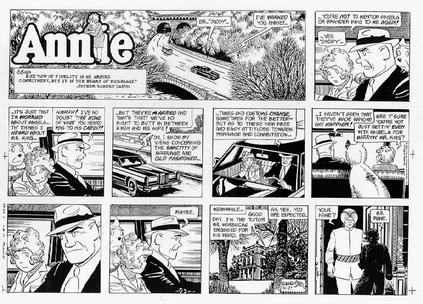 >>152108704I'm guessing this is from a time when newspaper reproduction was poor. No grayscales. Hatching or zip-a-tone screens would be the only ways to show a highlight.Leonard Starr was a terrific artist. A shame that, after On Stage ended, he wound up drawing Little Orphan Annie.