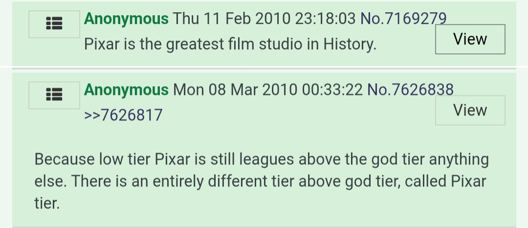 >>152105921Is it really so surprising? Inside Out was a personal project from one of Pixar's founding members, whereas Good Dinosaur was an environment test animation being played off as a "movie," not to mention its changing of the directors mid-production. Take a guess which one turned out better in the end.