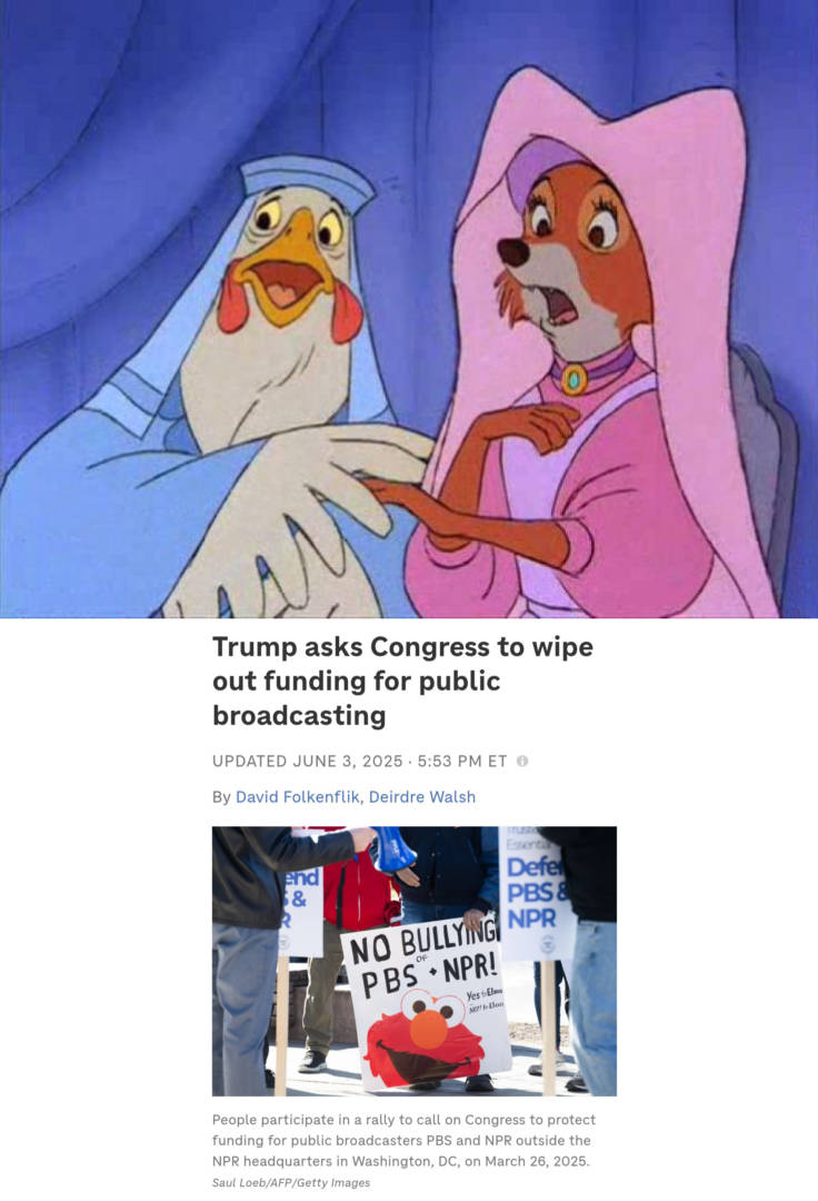 Say goodbye to the people who funded your favorite PBS cartoons, the Corporation for Public Broadcasting just dissolved itself.https://apnews.com/article/public-broadcasting-pbs-npr-b68f441c227ec7e076c038821b4a5931
