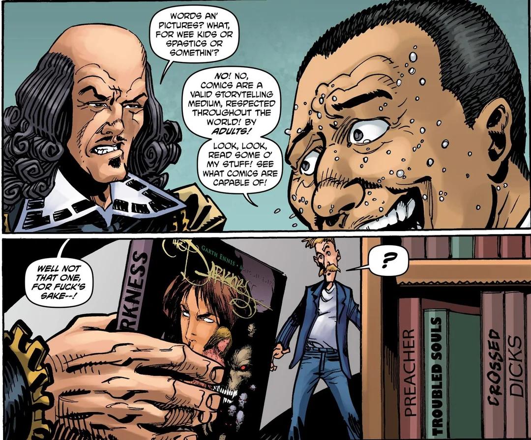 >>152161186Nah, Garth Ennis is just as much of a capeshit fan as all the people in this thread both praising and lambasting him. And he's the same as a lot of other cape comic writers, he's got his obvious faves and the guys he really hates, and he's also got a huge ego and love for trying to act more "mature" than he really is. And he's got a rather warped view of superheroes and WWII that doesn't really quite map to the reality of the situation, especially in regards to Captain America.And that's fine. You can be a good writer but still have flaws. He doesn't have to be perfect, he can be good. Problem is that his fanboys refuse to see that, so any criticism of the man is liable to get screams of how someone's just a whiny crybaby who can't stand to see their favorite heroes taken down a peg, when it's just Garth being a juvenile dumbass ragging on cape heroes he doesn't like in the exact same vein as every other cape comic writer of his ilk. Just with more rape and peepee poopoo jokes thrown in.Garth Ennis is in the comics business cause he likes comics and cape comics in particular. People just refuse to treat him like the human he is instead of some divine prophet revealing to the world that cape comics...not super deep and complex and kind of juvenile at heart.When this is the same guy who made a character named Arseface and made a crappy zombie comic where some evil redneck whacks a guy in the face with a ripped off horse cock and admitted he wrote The Darkness for cash despite hating it. Like, seriously, comics aren't always that deep, and neither is Garth Ennis.