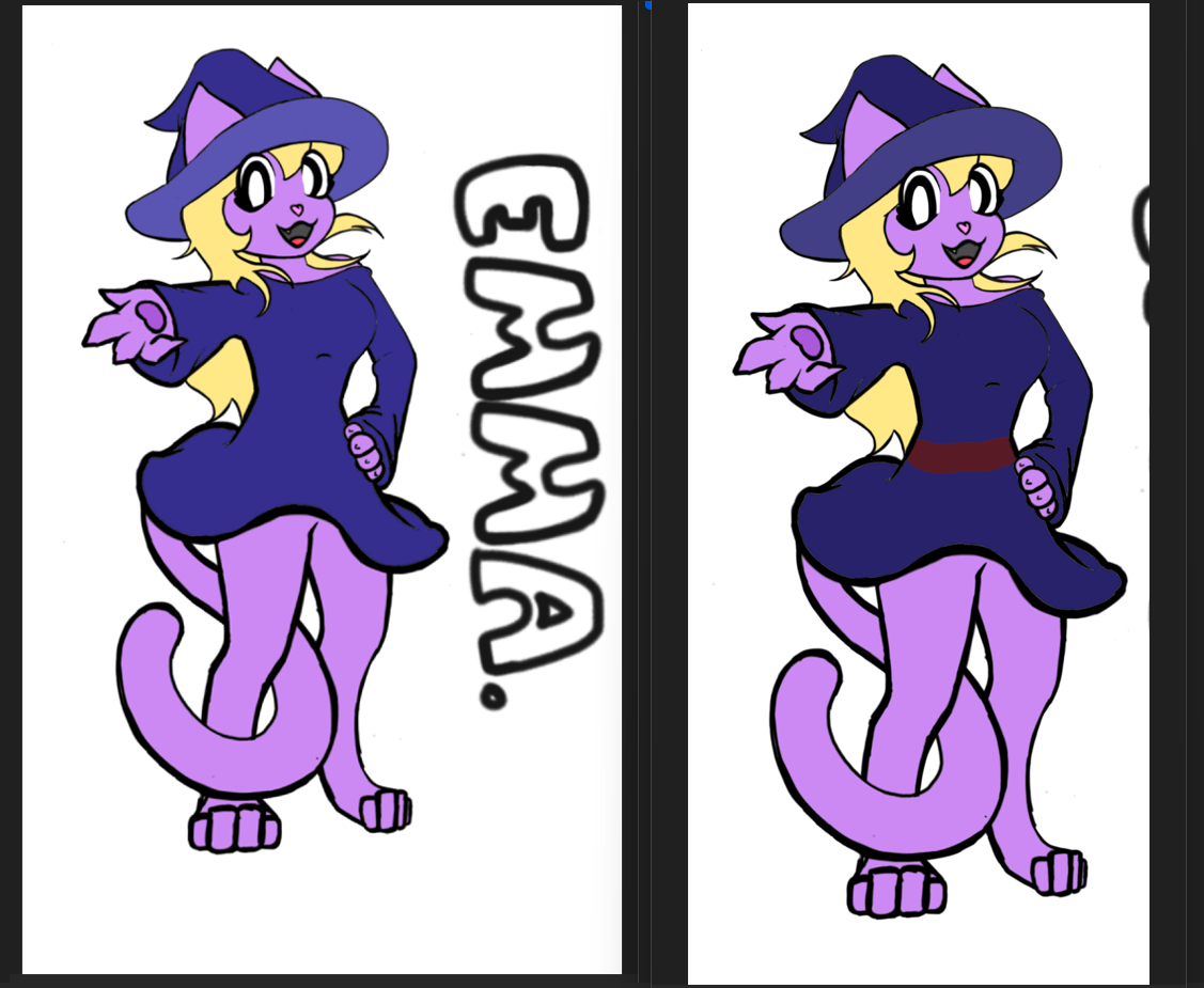 Looking at your twitter, I think you had it correct with the first color scheme. I would try to keep it to at most, three main colors. In this case, it would be her hair, fur, and outfit. Add in some small accents in the detailed portrait (I added a red sash) but what this anon said >>152121111 her fur and outfit makes her the purple character.