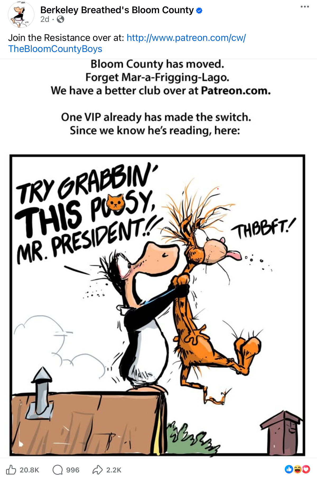 >>152131260>Bloom County/Outland but then they all left by the mid-90s.Bloom County has actually been making new comics for the past 10 years, but it’s only been Facebook exclusive and he just started paywalling comics on Patreon a few days ago.