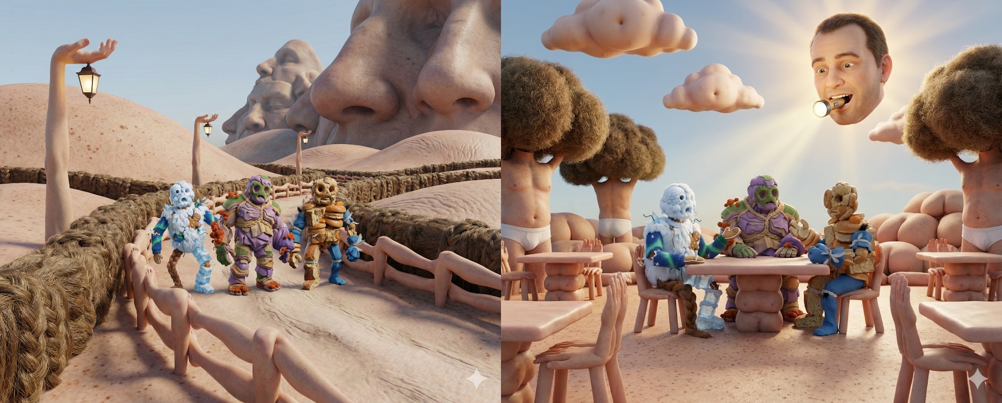 Generate a brand new 3D render of a single humanoid figure against a pure white background.The figure must be a fully three-dimensional object with real volume, depth, thickness, and physical presence. Flat illustrations, cutouts, silhouettes, or 2D collage effects are not permitted.The humanoid is constructed exclusively from the materials, textures, objects, and features present in the referenced landscape image. No new materials, anatomy, or surface types may be introduced.Landscape elements are physically reassembled into body mass:Terrain layers, cliffs, and ground planes become solid torso and limb volumes with thickness and edge depthRidges, seams, roads, or rivers become raised joints, tendons, or structural connectorsRepeating landscape features may appear multiple times as redundant or misplaced anatomyThe figure does not need to be anatomically correct or visually coherent. Proportions should be irregular and unsettling, with mismatched limb sizes, uneven symmetry, and abrupt material transitions. The construction should feel stacked, bolted, layered, or fused — not drawn.If the landscape contains circular, architectural, or recurring forms, they may be reused as deep-set cavities, voids, or eye-like structures with visible interior depth.Surface detail must show dimensionality: overhangs, undercuts, occlusion shadows, overlapping layers, and intersecting forms. Materials must wrap around volumes rather than lie flat.The pose is stiff and awkward, as if the object has been physically assembled and propped upright. From a distance it reads as a humanoid mass; up close it resolves into chaotic construction.Lighting is neutral studio lighting designed to reveal form: clear key light, soft fill, visible contact shadows and ambient occlusion. No environment, no illustrated shading, no flat graphic treatment.Do not stylize, flatten, or simplify. The result should read as a failed three-dimensional reconstruction made from landscape matter.