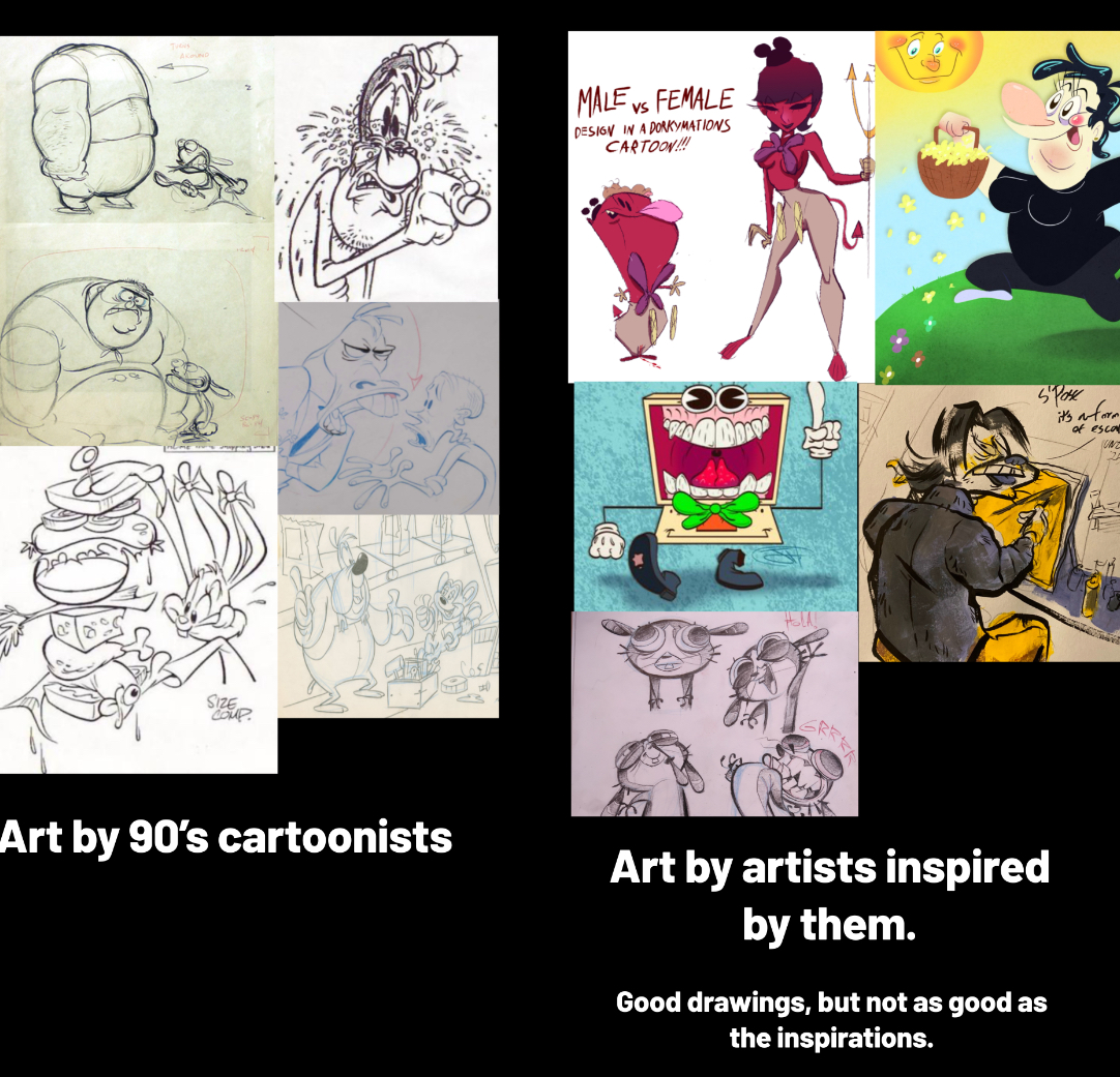 >>151897632Exactly. You will NOT improve your art skills if all you do is copy other drawings, especially when starting out. Eventually, you will stagnate and skill regression will kick in.Older cartoonists have superior art because they drew from life before they learned to draw cartoons. They were inspired by all sorts of things, not just cartoons.