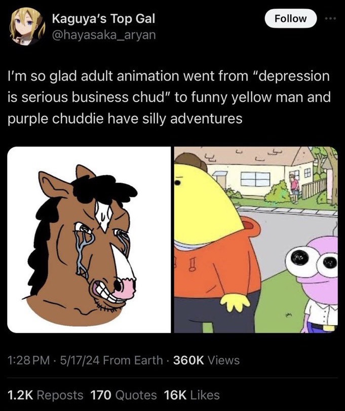 >>151884612Bojak just isn't funny. There aren't many jokes and the ones it tries to make don't land. It would be like if you took Rick and Morty, removed all the wacky adventures, took Rick out, and just spent the entire show focusing on Beth and Jerry arguing and being unhappy. There's no arc, there's no character development, just asshole hollywood celebrities complaining about bullshit and some of them are animal people for some reason.