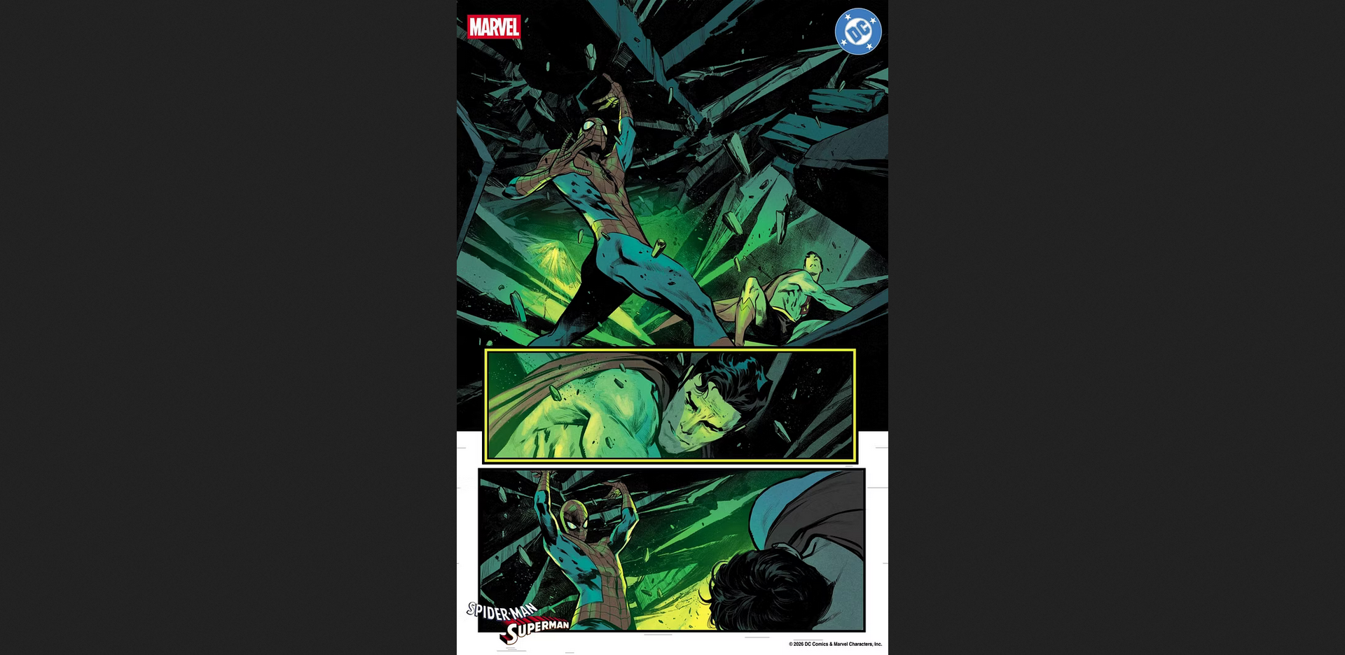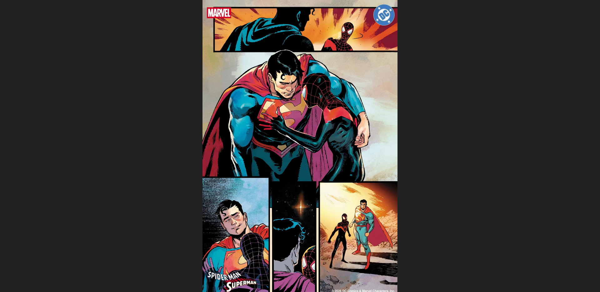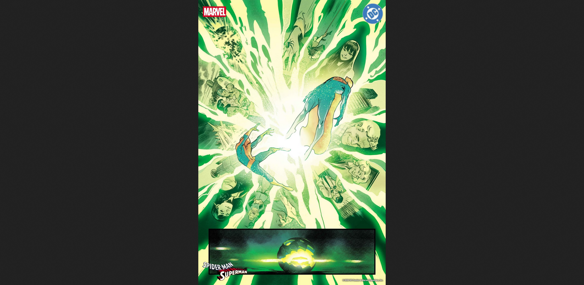 Get a sneak peek at 8 pages from Marvel’s All-New All-Different Spider-Man/Superman crossover event.Top creators like Geoff Johns, Brian Michael Bendis, and Jeph Loeb join forces for epic team-up stories.Watch Spider-Man and Superman’s worlds collide, bringing heroes and villains from both universes together.Highlights include Miles Morales with Superman, a Supergirl/Ghost-Spider adventure, and more crossovers